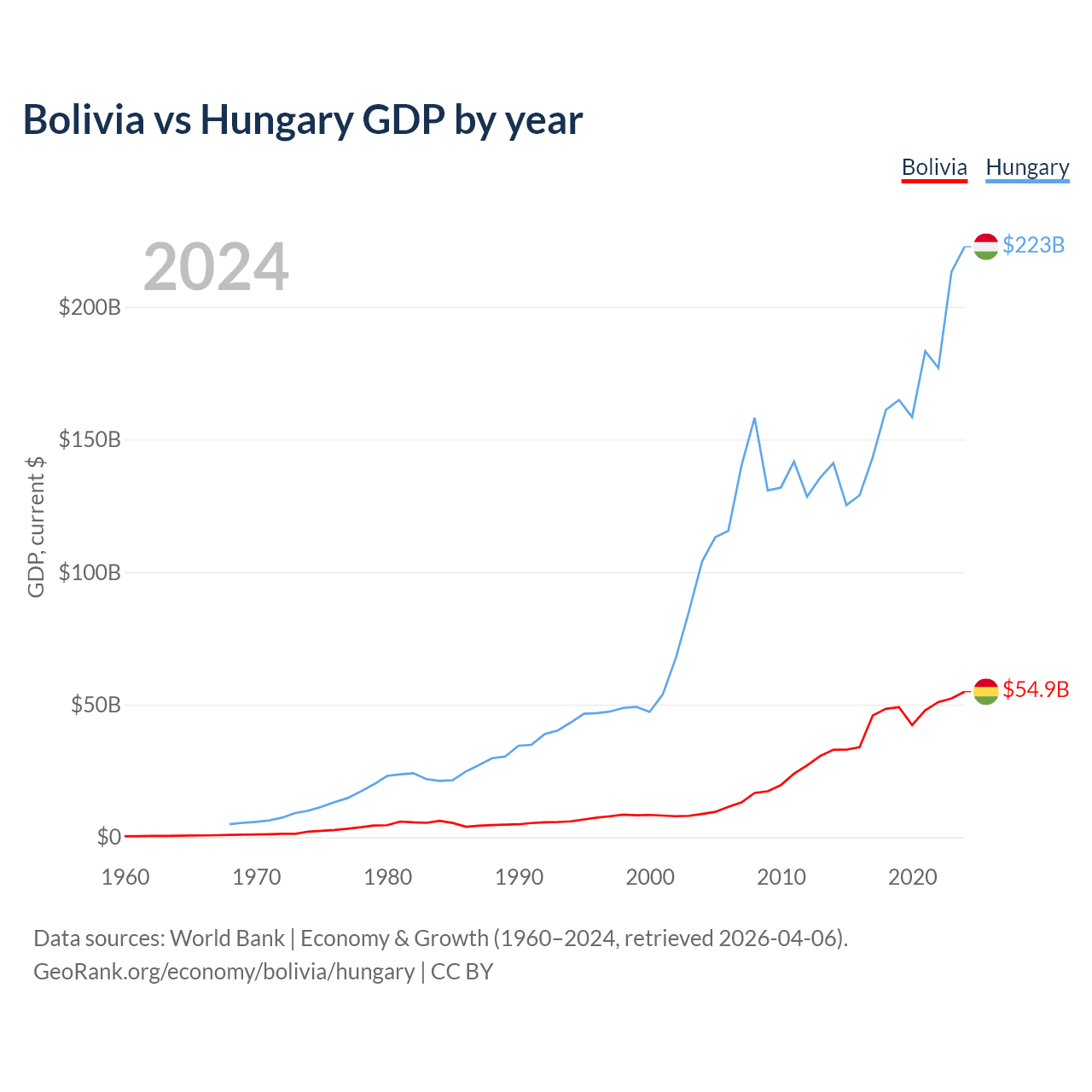 Bolivia has a GDP of $54.9B compared to $223B for Hungary, ranking 88/197 and 55/197 by economy size, respectively.