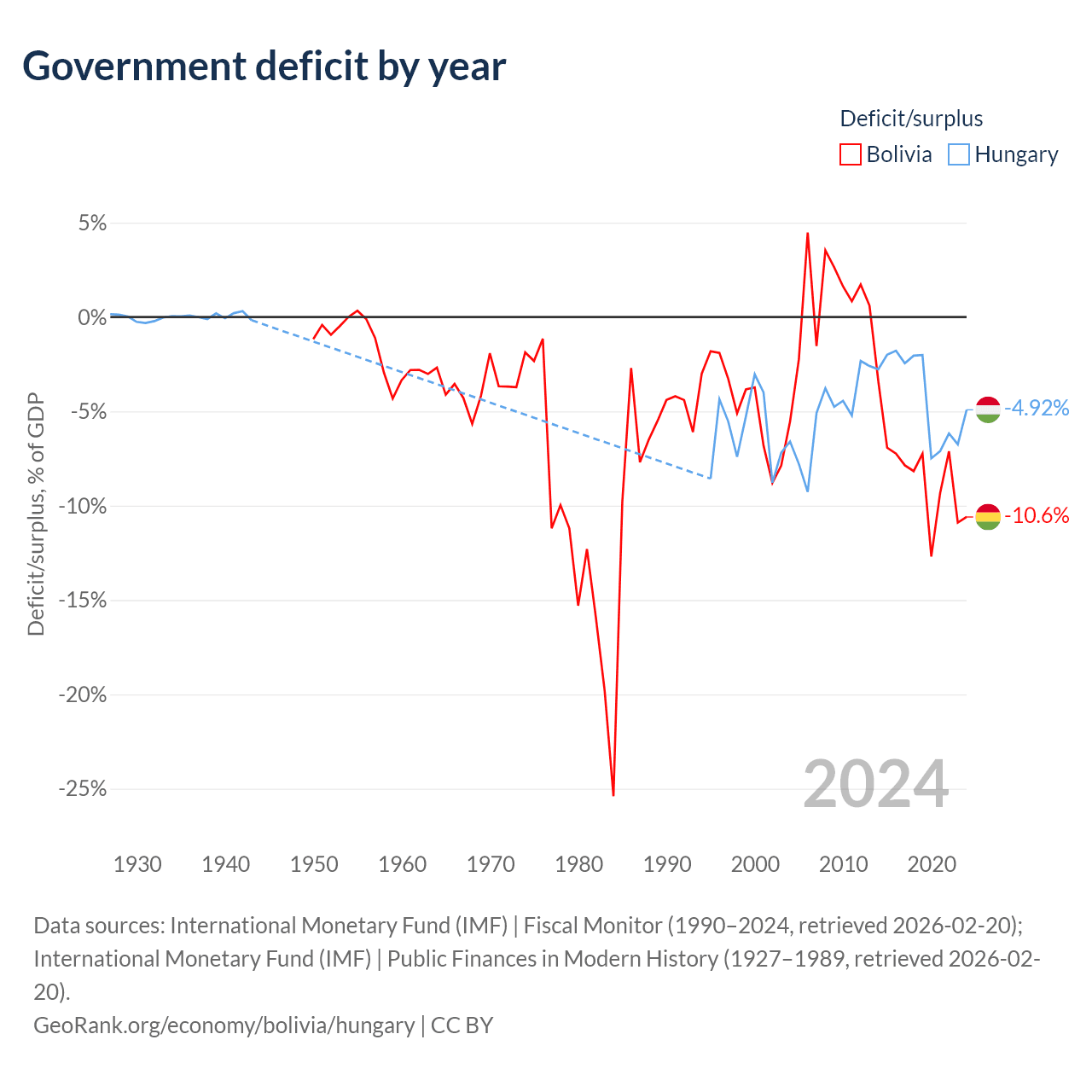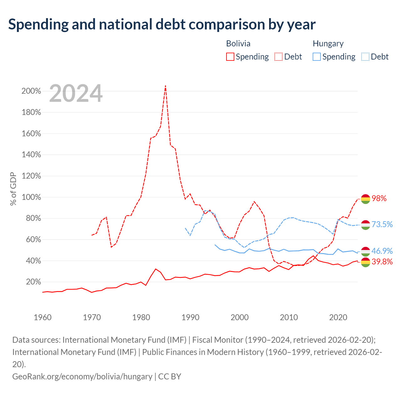 Bolivia has $53.8B in government debt (98% of GDP), compared to $164B (73.5% of GDP) in Hungary.