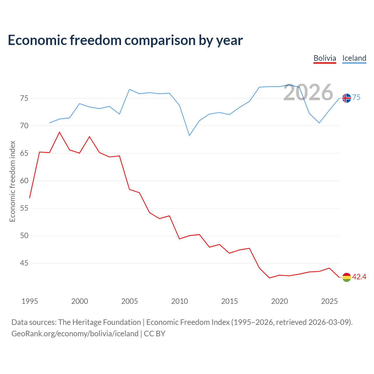 The Economic Freedom Index for Bolivia is 42.4, ranking 184/197, compared to 75 for Iceland, ranking 19/197. The chart above displays a comparison of annual changes in economic freedom indexes.