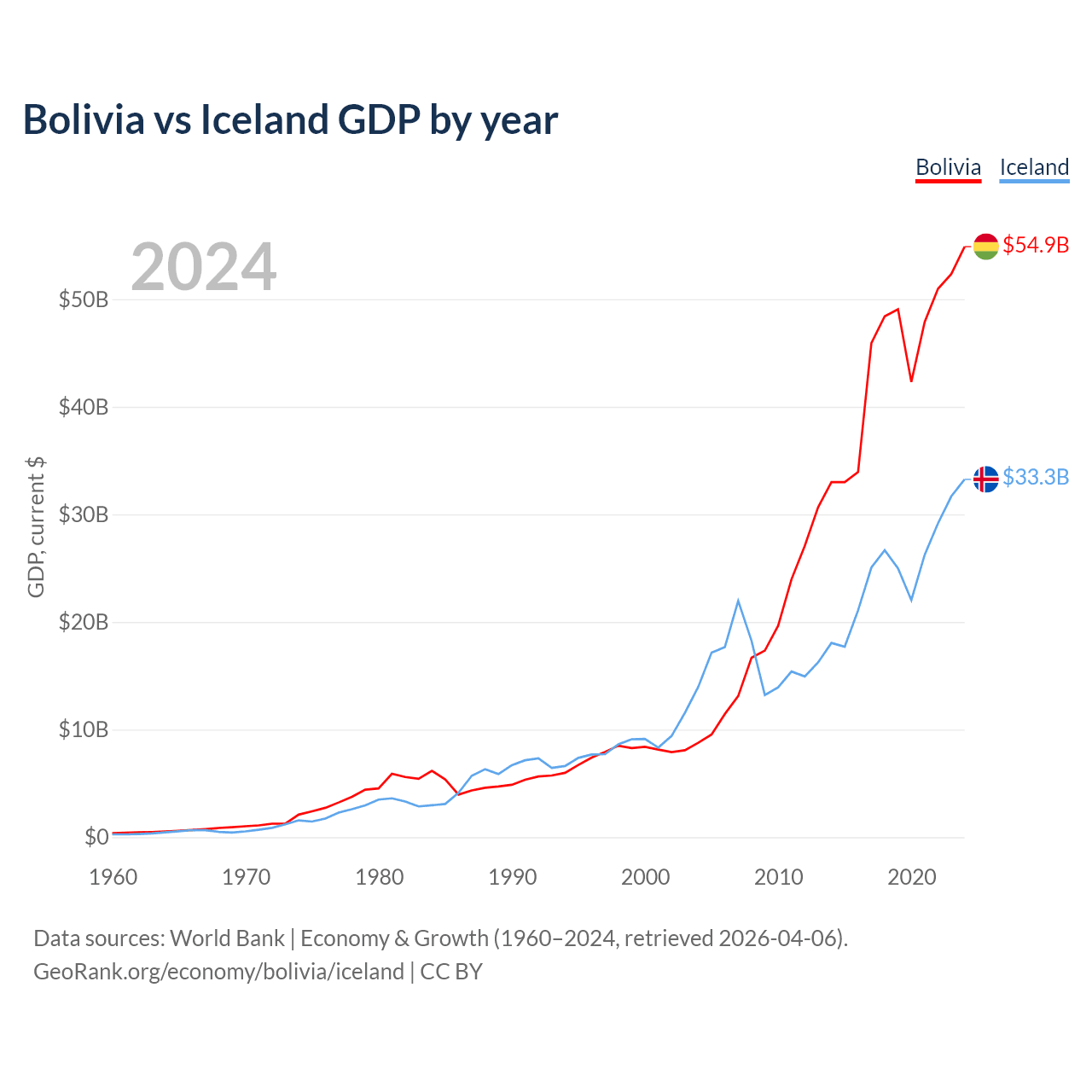 Bolivia has a GDP of $54.9B compared to $33.3B for Iceland, ranking 88/197 and 108/197 by economy size, respectively.