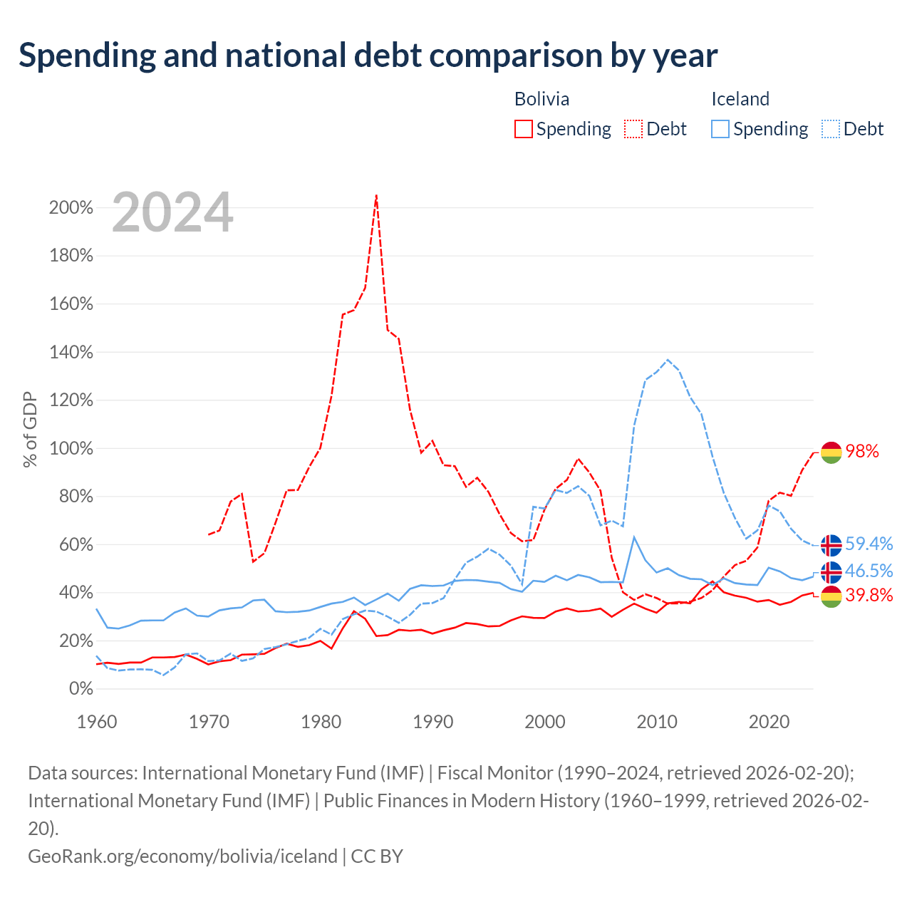 Bolivia has $53.8B in government debt (98% of GDP), compared to $19.8B (59.4% of GDP) in Iceland.