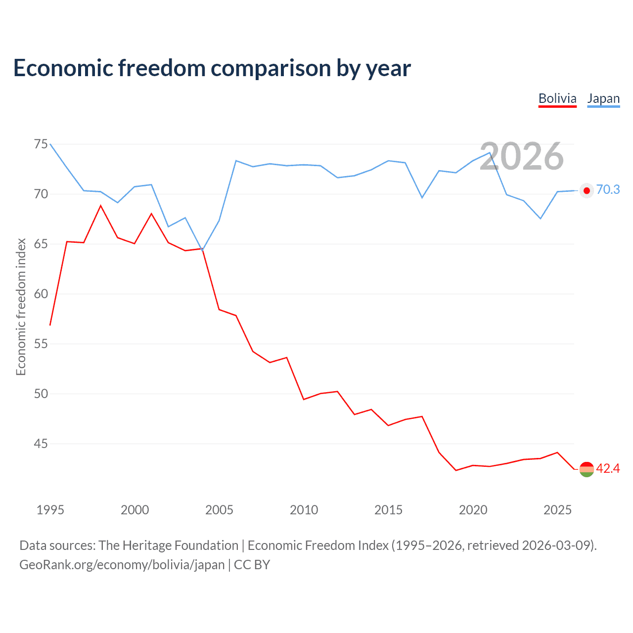 The Economic Freedom Index for Bolivia is 42.4, ranking 184/197, compared to 70.3 for Japan, ranking 36/197. The chart above displays a comparison of annual changes in economic freedom indexes.