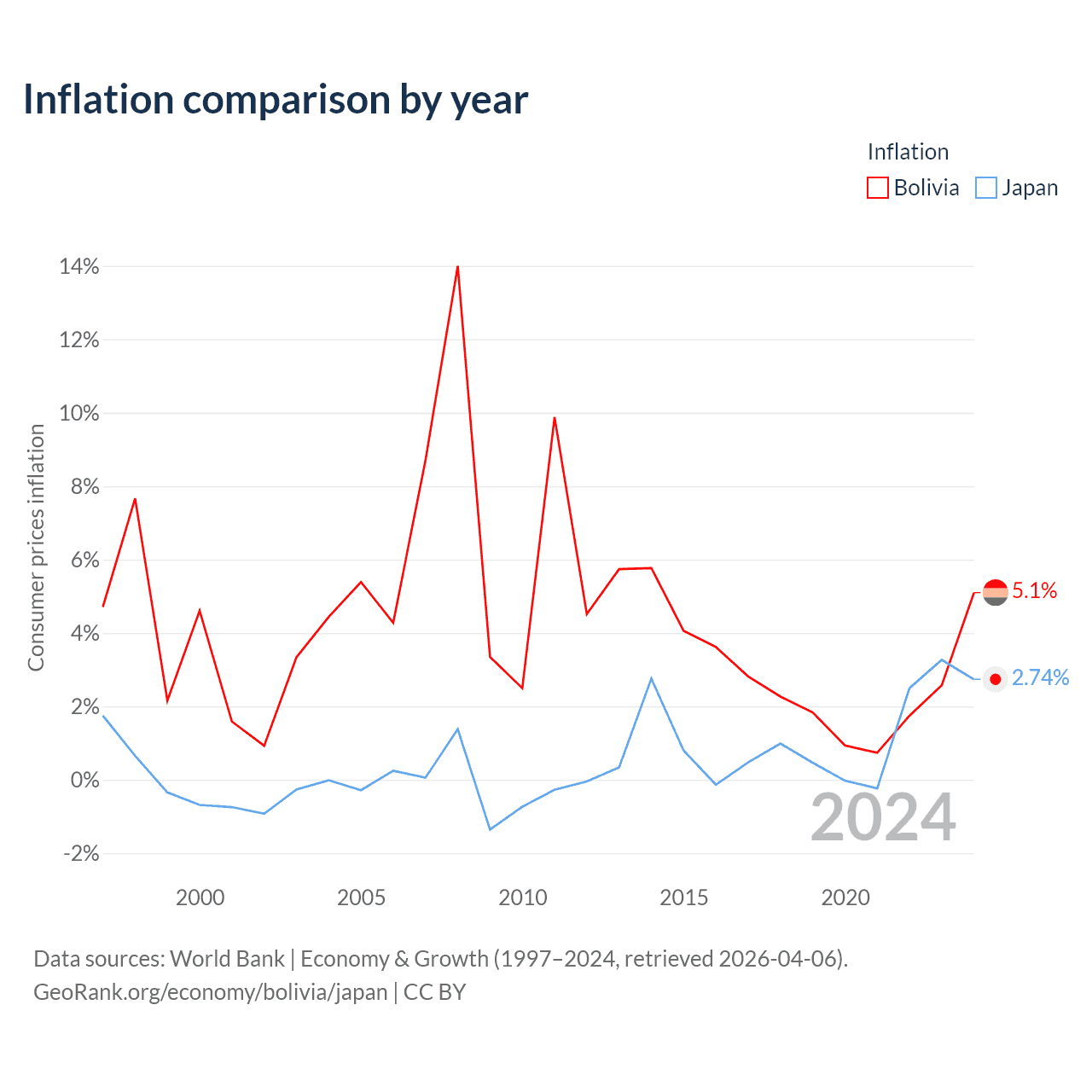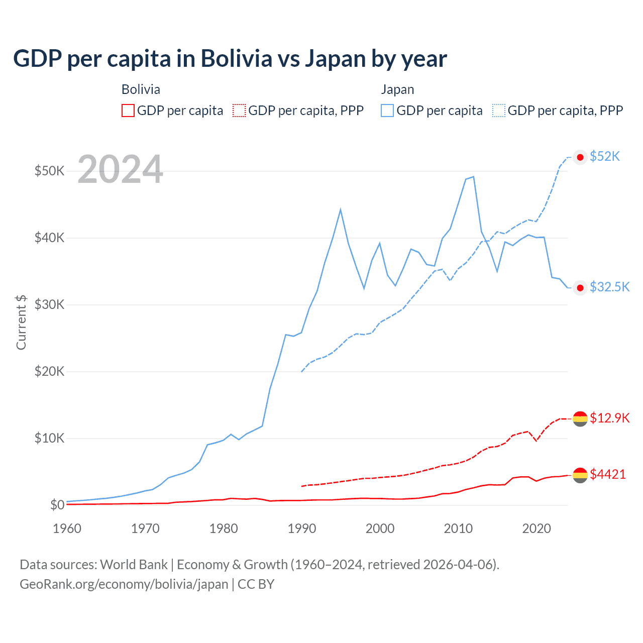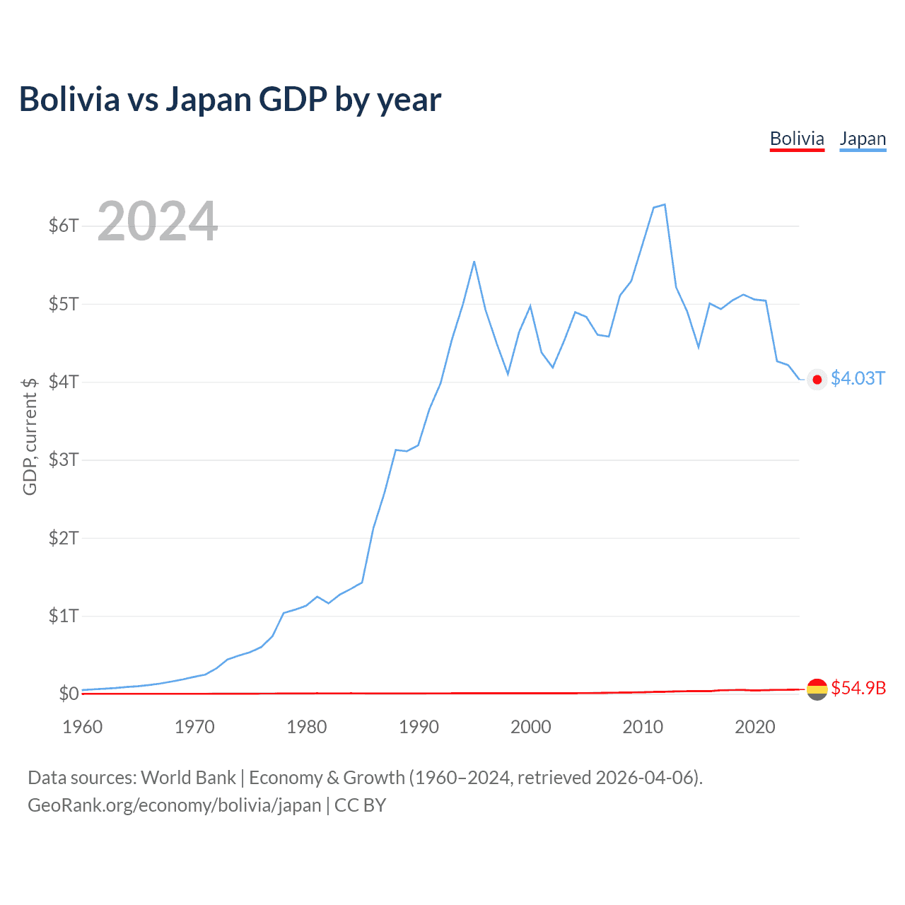 Bolivia has a GDP of $54.9B compared to $4.03T for Japan, ranking 88/197 and 4/197 by economy size, respectively.