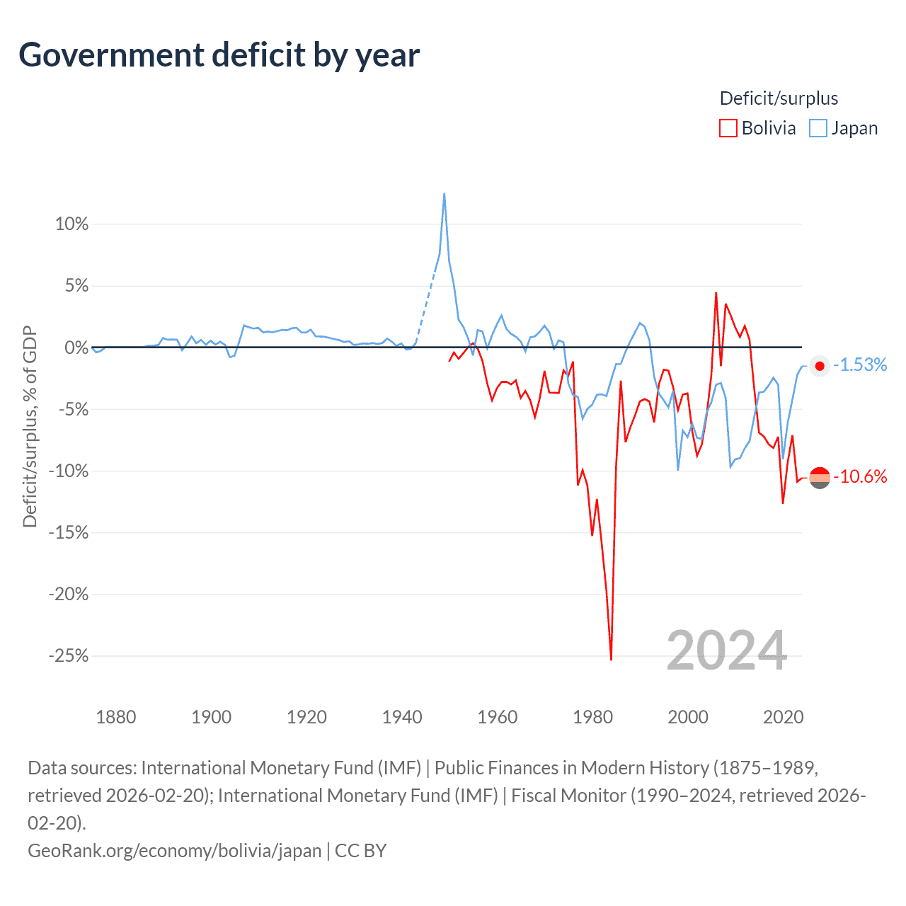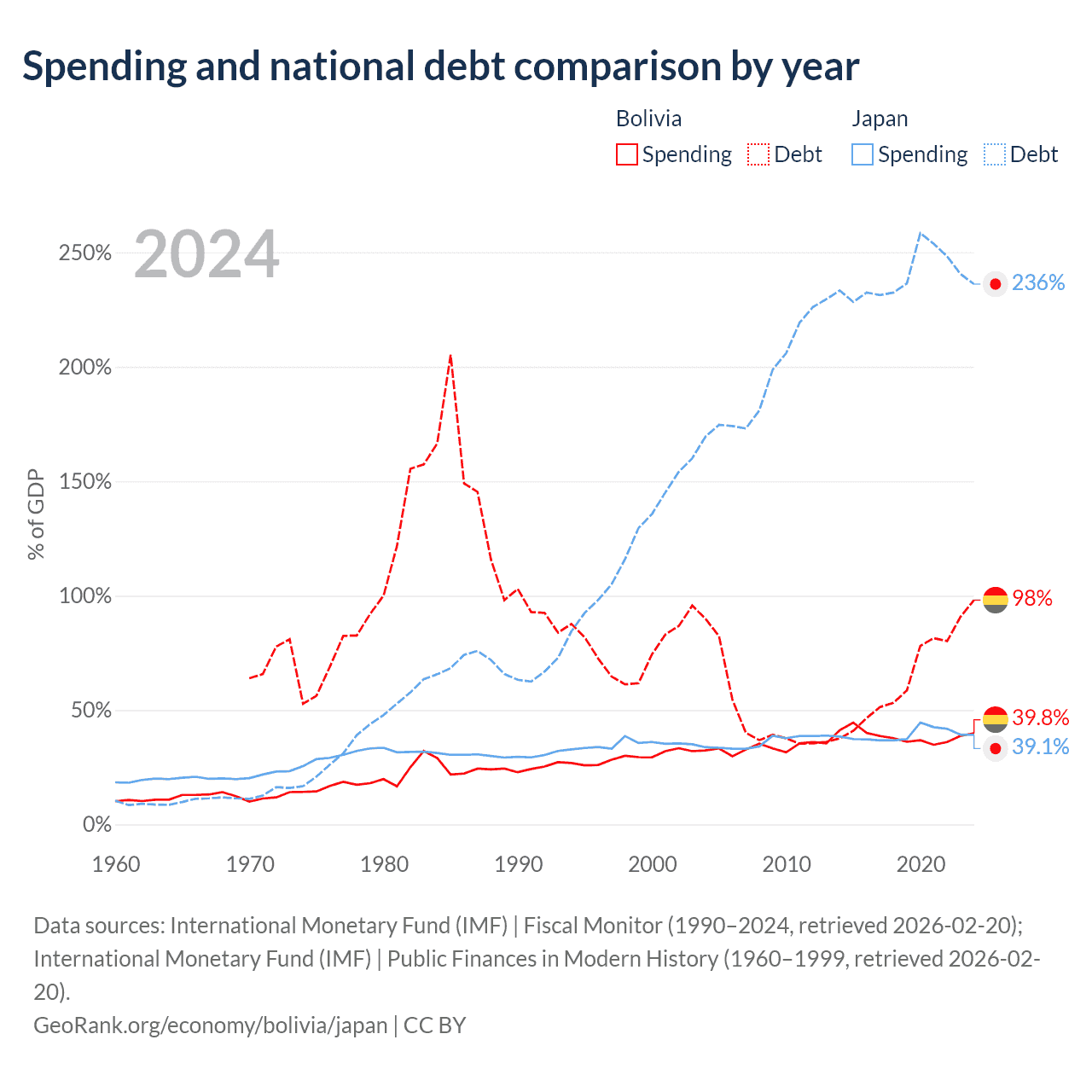 Bolivia has $53.8B in government debt (98% of GDP), compared to $9.51T (236.1% of GDP) in Japan.