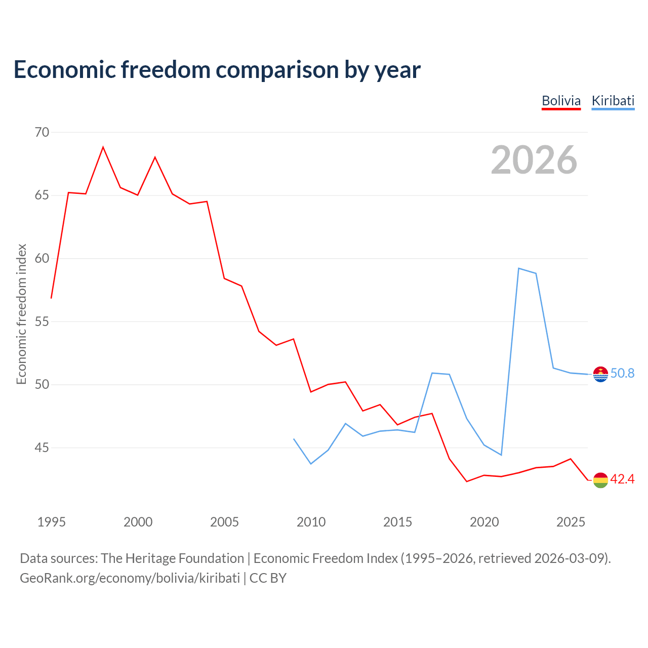 The Economic Freedom Index for Bolivia is 42.4, ranking 184/197, compared to 50.8 for Kiribati, ranking 158/197. The chart above displays a comparison of annual changes in economic freedom indexes.