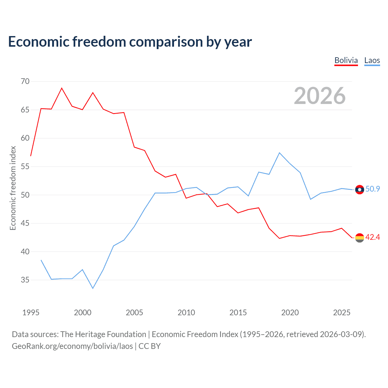 The Economic Freedom Index for Bolivia is 42.4, ranking 184/197, compared to 50.9 for Laos, ranking 157/197. The chart above displays a comparison of annual changes in economic freedom indexes.