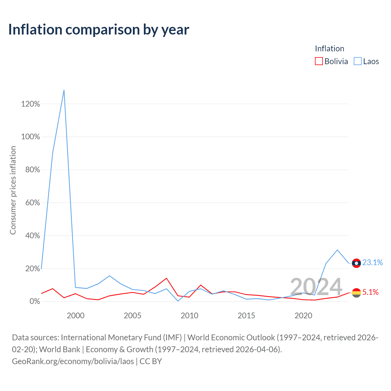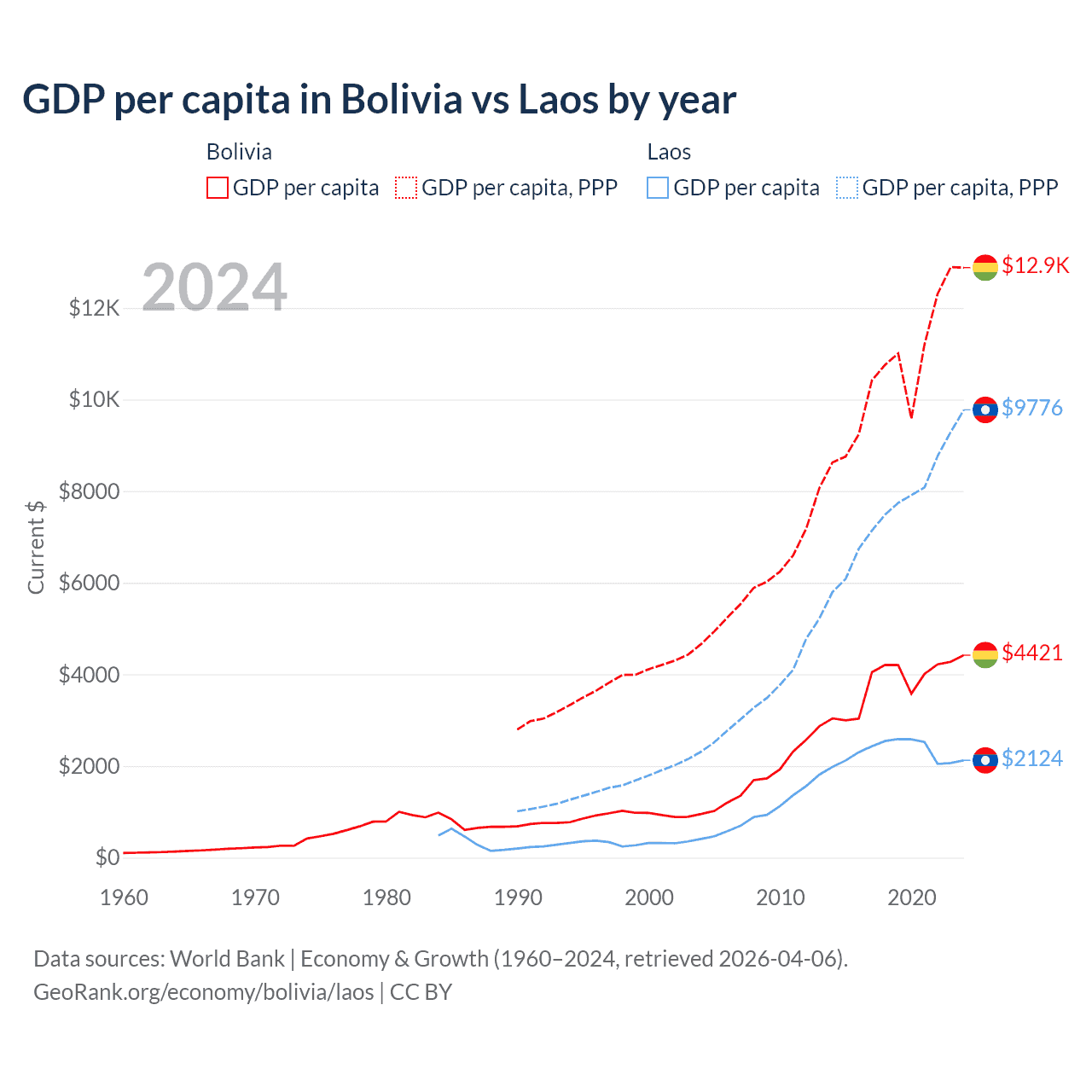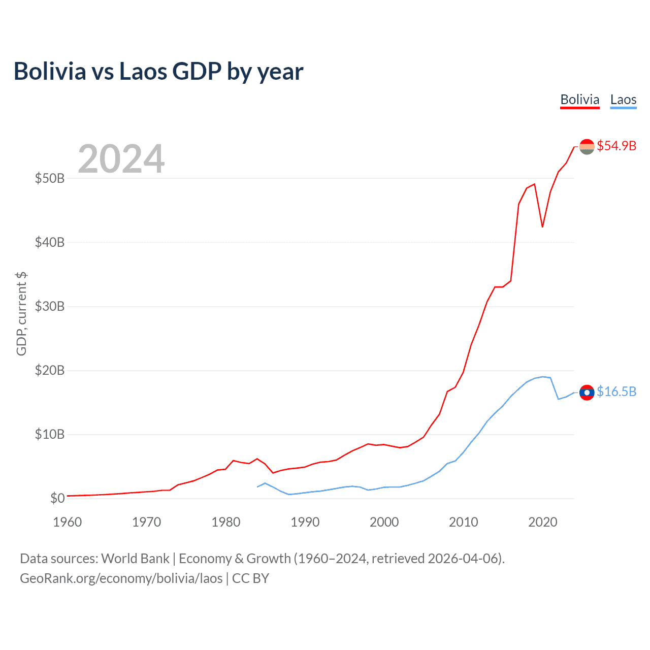 Bolivia has a GDP of $54.9B compared to $16.5B for Laos, ranking 88/197 and 139/197 by economy size, respectively.