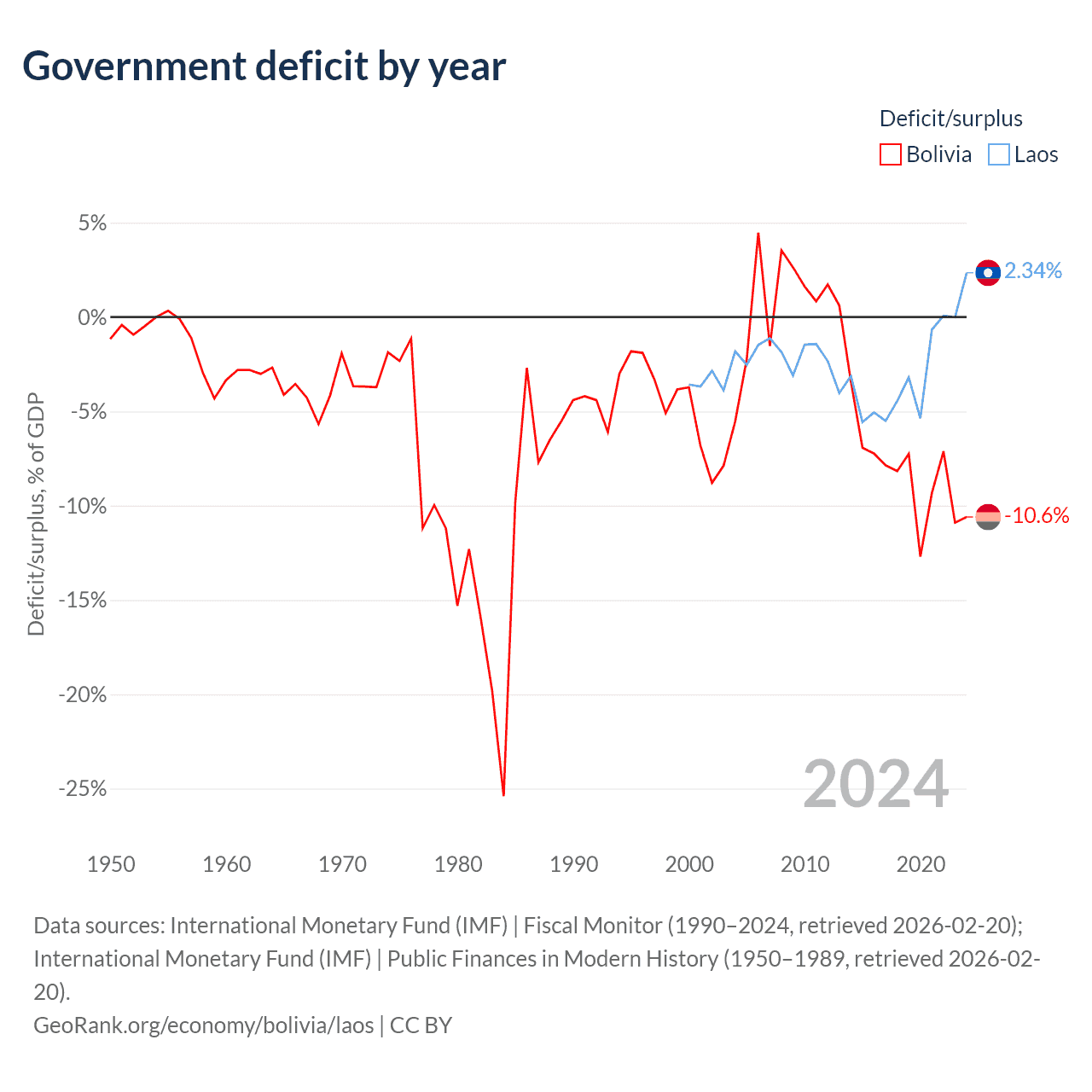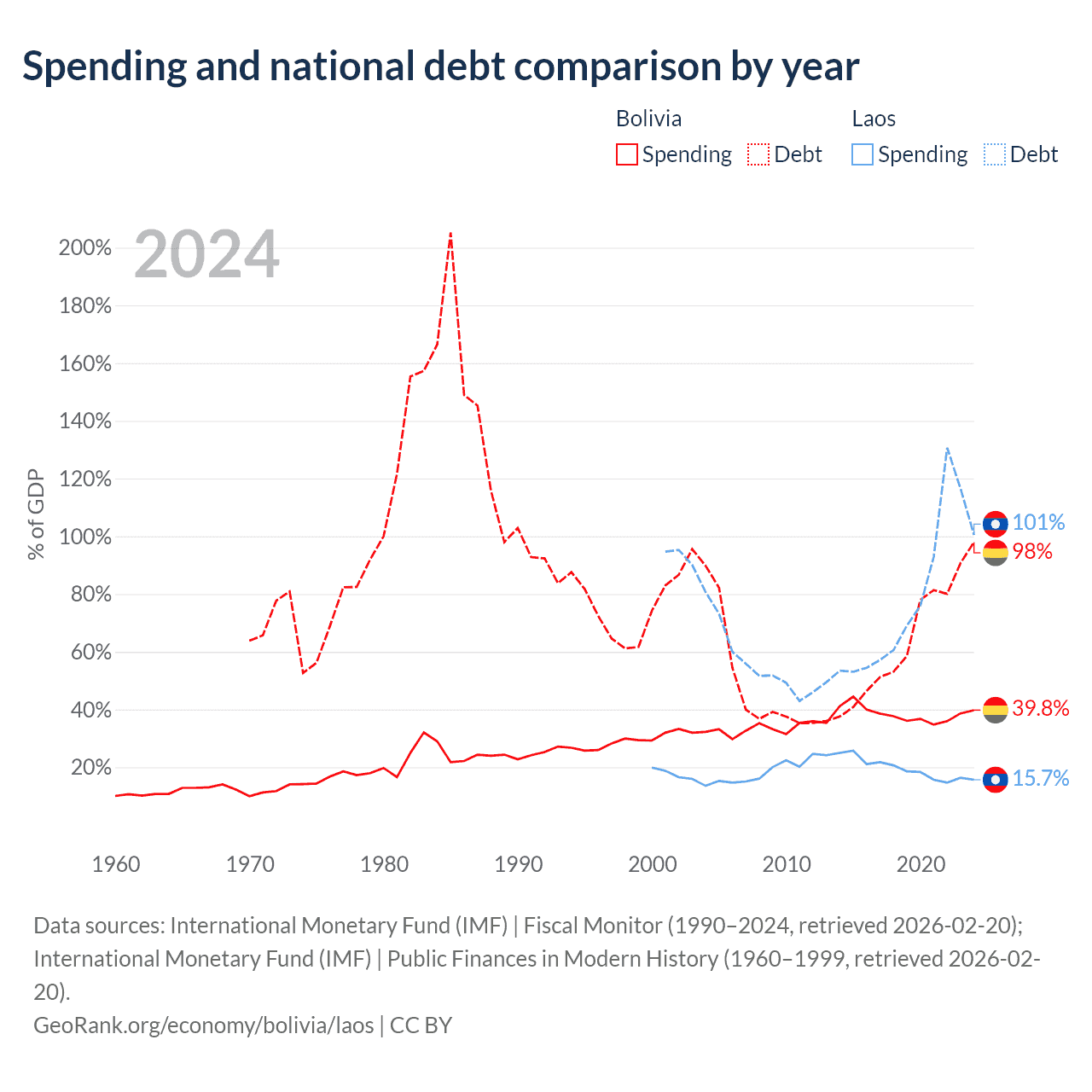 Bolivia has $53.8B in government debt (98% of GDP), compared to $16.6B (100.5% of GDP) in Laos.