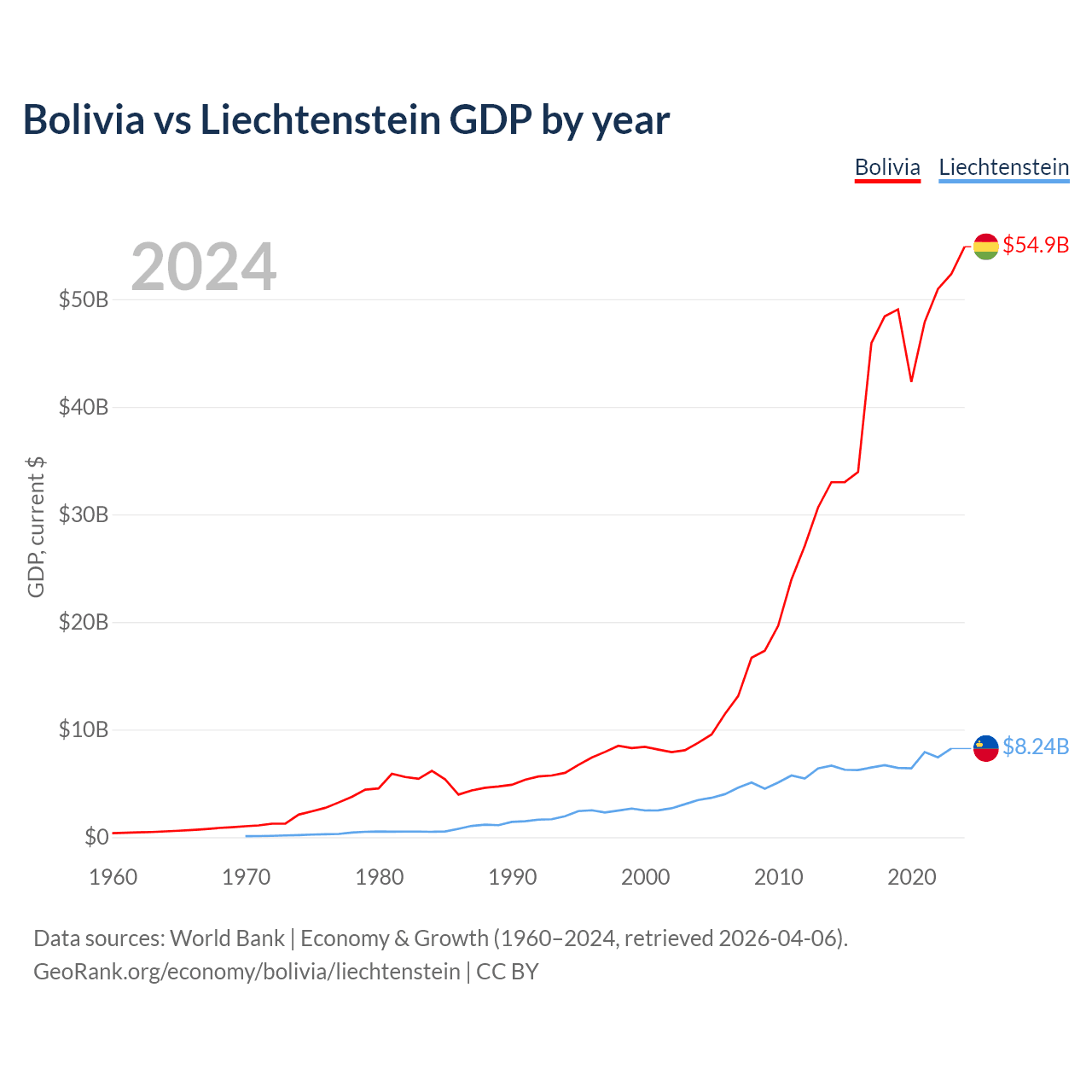 Bolivia has a GDP of $54.9B compared to $8.24B for Liechtenstein, ranking 88/197 and 156/197 by economy size, respectively.