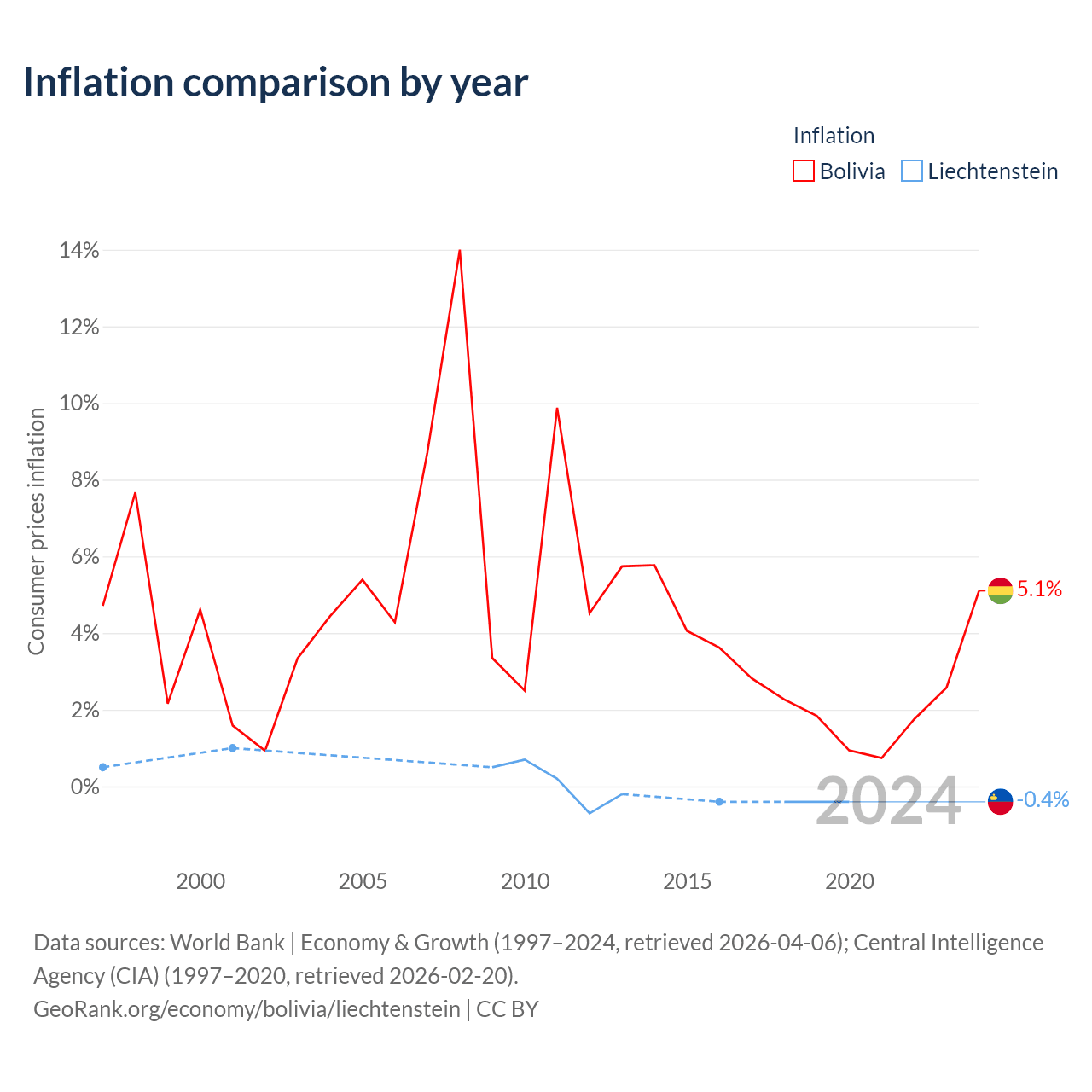 Over the past 24 years, Bolivia has recorded an average annual inflation rate of 4.55%, compared with 0.04% in Liechtenstein. In 2020, inflation was 5.1% in Bolivia and -0.4% in Liechtenstein.