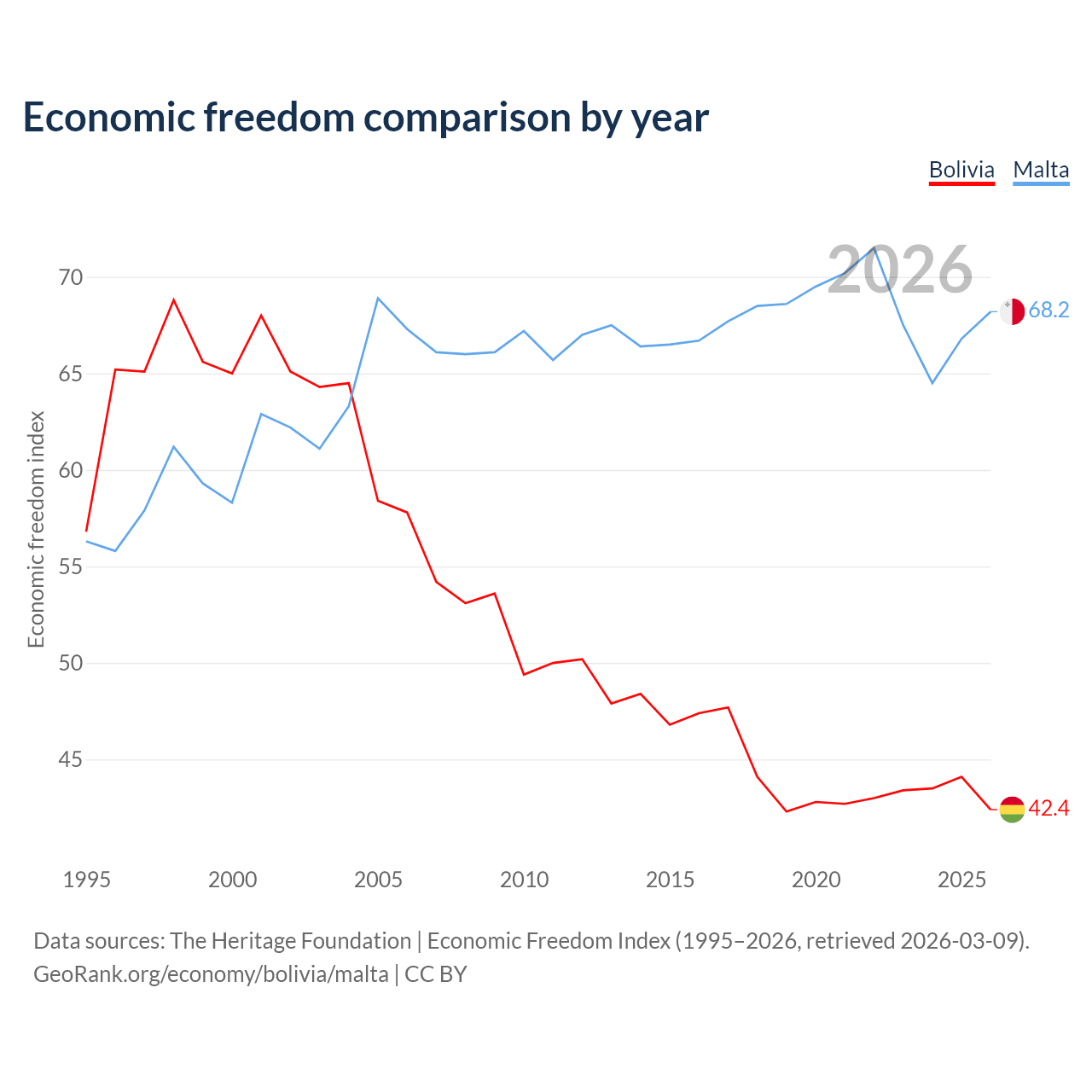 The Economic Freedom Index for Bolivia is 42.4, ranking 184/197, compared to 68.2 for Malta, ranking 49/197. The chart above displays a comparison of annual changes in economic freedom indexes.