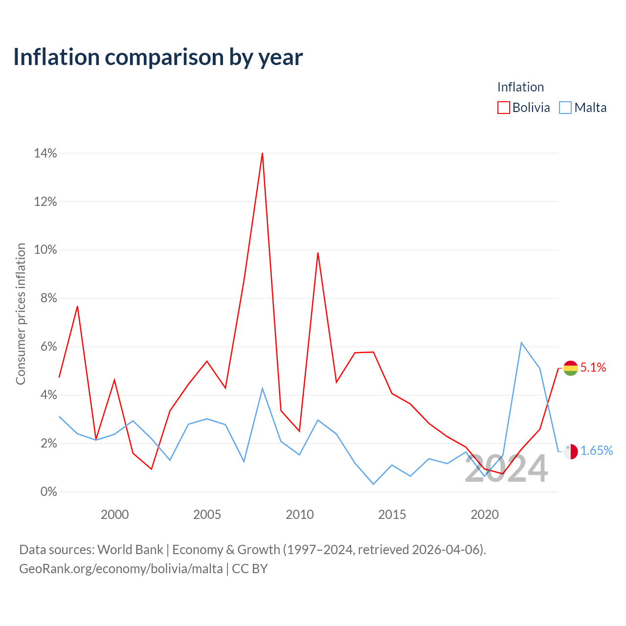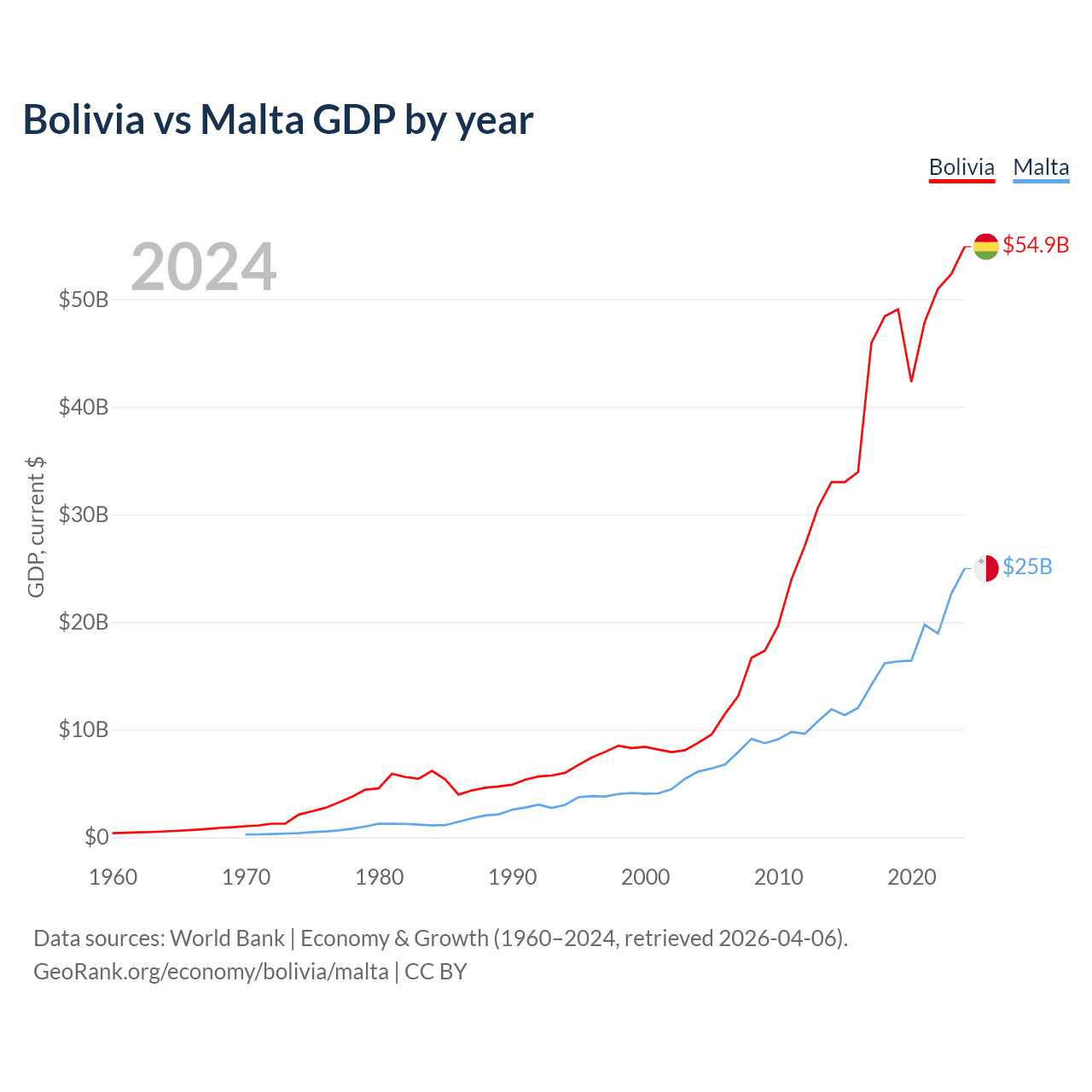 Bolivia has a GDP of $54.9B compared to $25B for Malta, ranking 88/197 and 119/197 by economy size, respectively.