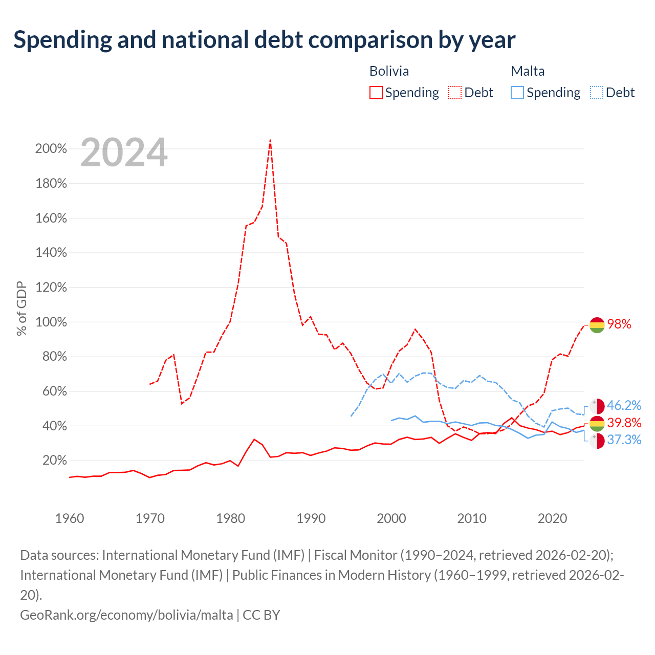 Bolivia has $53.8B in government debt (98% of GDP), compared to $11.5B (46.2% of GDP) in Malta.