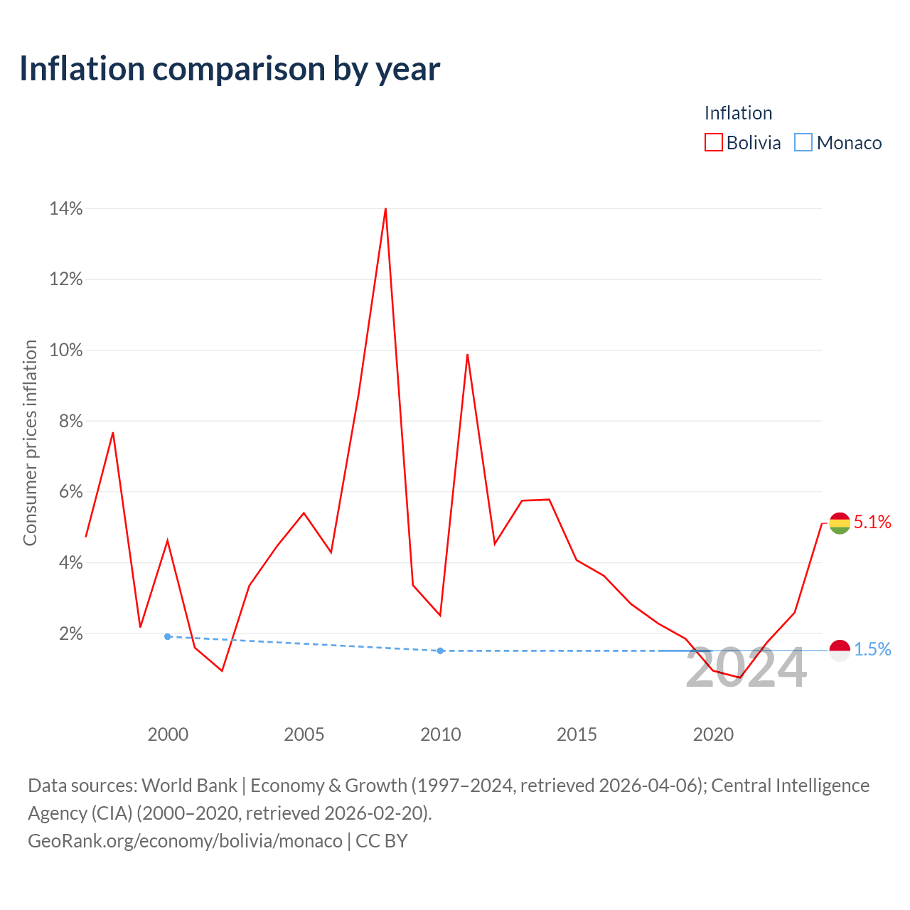 Over the past 21 years, Bolivia has recorded an average annual inflation rate of 4.5%, compared with 1.58% in Monaco. In 2020, inflation was 5.1% in Bolivia and 1.5% in Monaco.