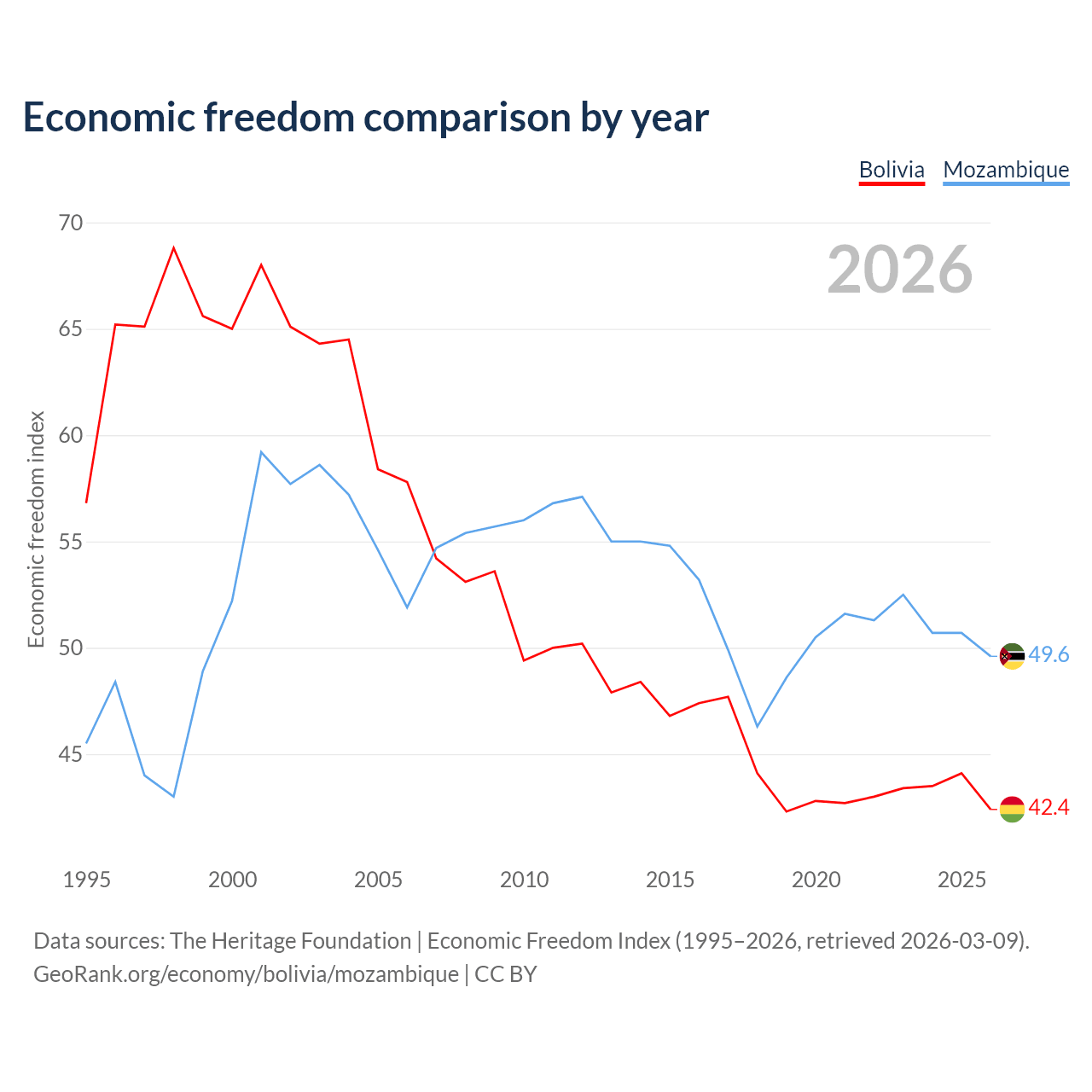 The Economic Freedom Index for Bolivia is 42.4, ranking 184/197, compared to 49.6 for Mozambique, ranking 164/197. The chart above displays a comparison of annual changes in economic freedom indexes.