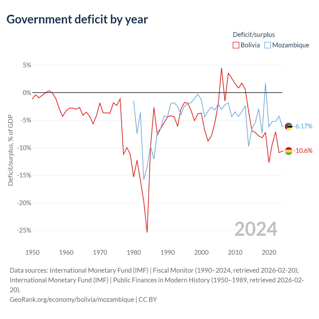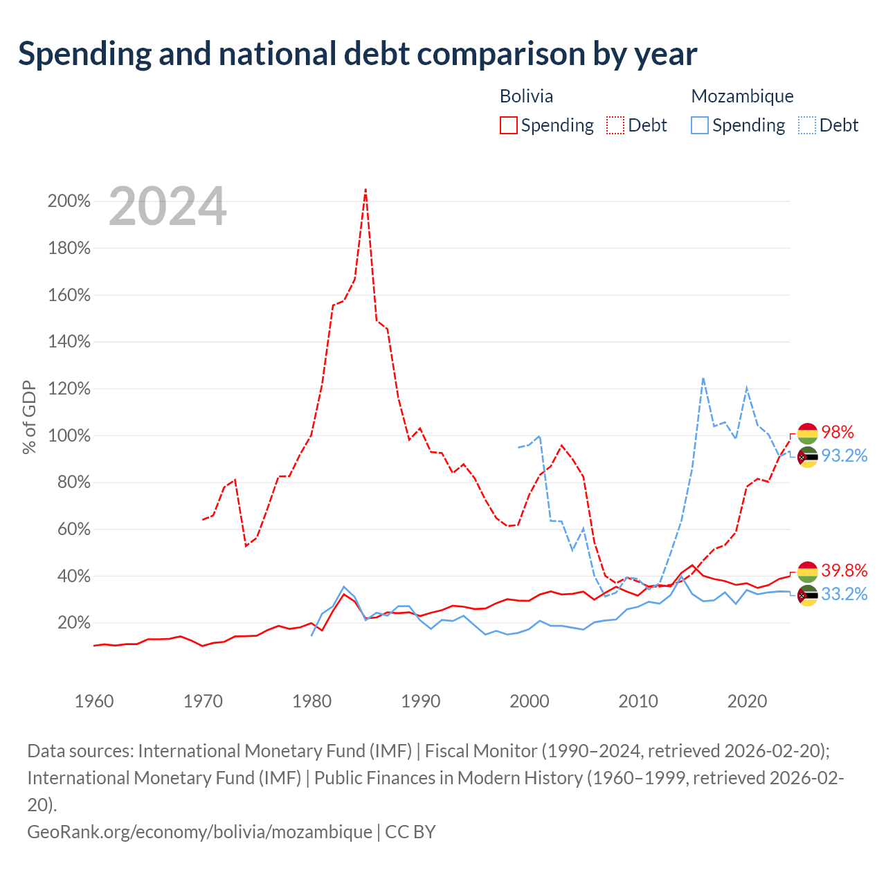 Bolivia has $53.8B in government debt (98% of GDP), compared to $21.2B (93.2% of GDP) in Mozambique.