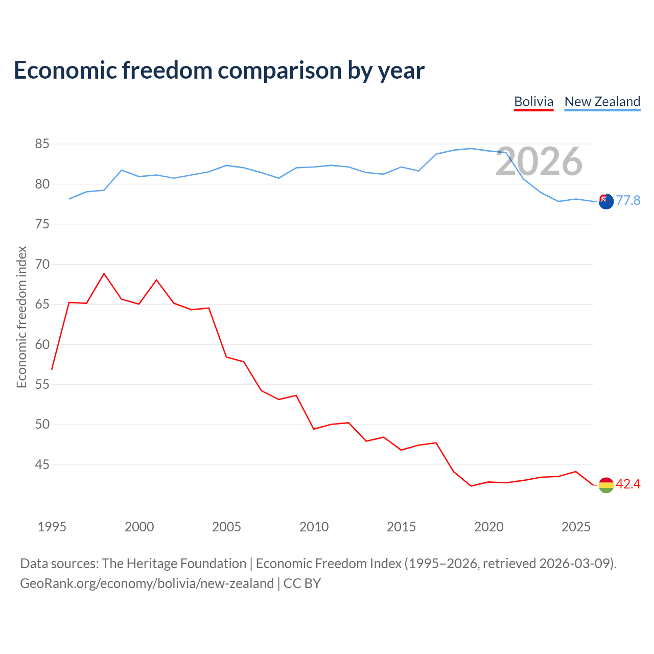 The Economic Freedom Index for Bolivia is 42.4, ranking 184/197, compared to 77.8 for New Zealand, ranking 13/197. The chart above displays a comparison of annual changes in economic freedom indexes.