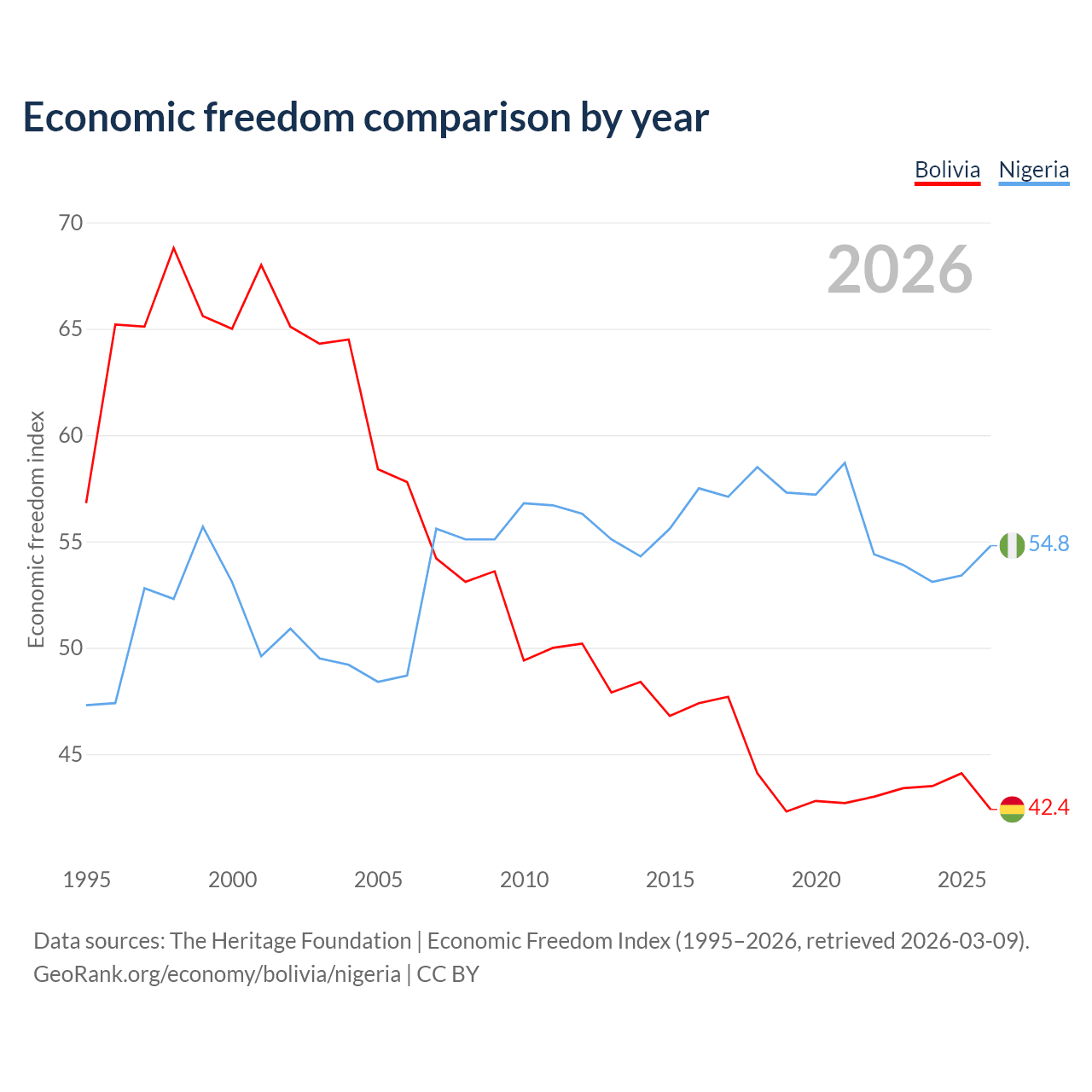 The Economic Freedom Index for Bolivia is 42.4, ranking 184/197, compared to 54.8 for Nigeria, ranking 132/197. The chart above displays a comparison of annual changes in economic freedom indexes.
