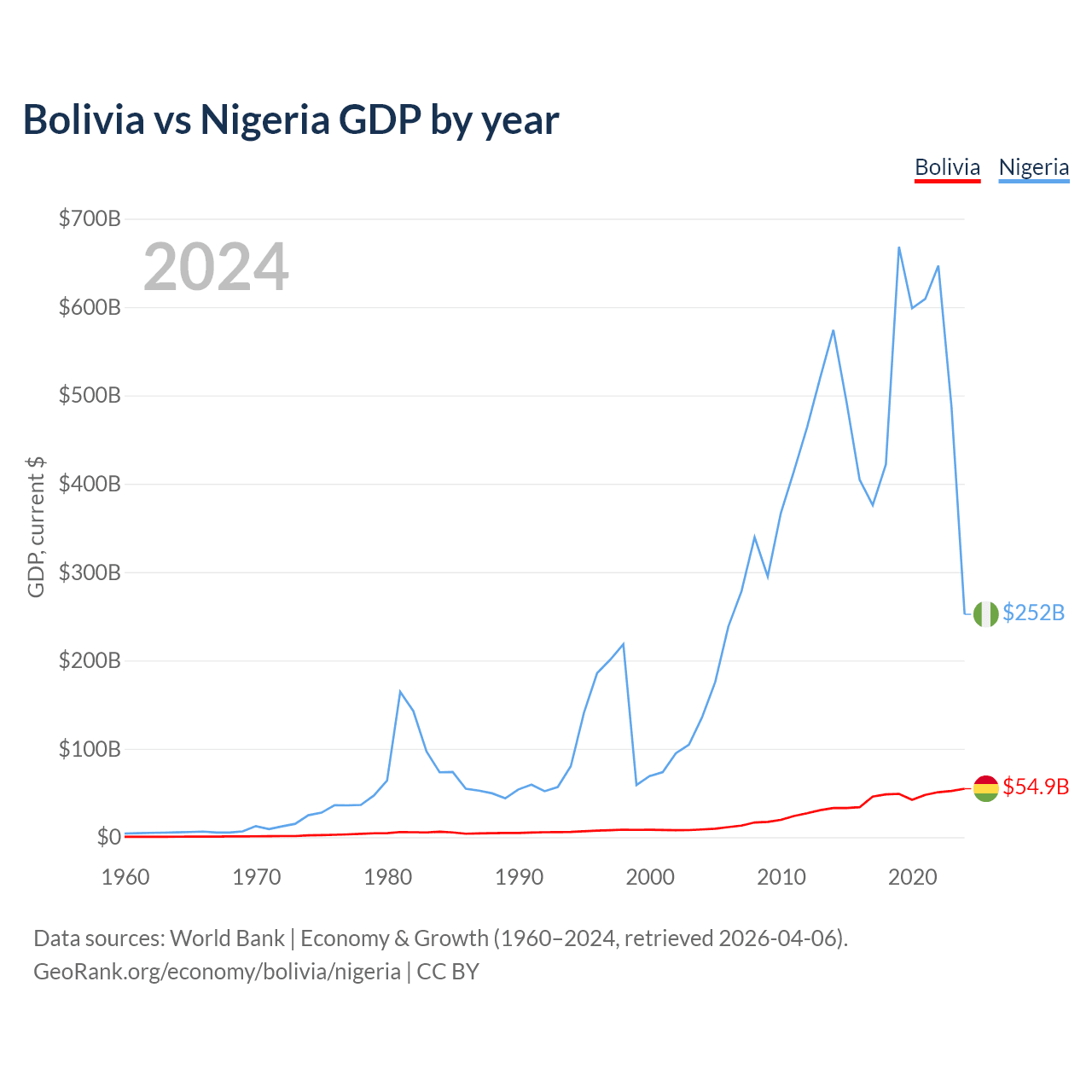 Bolivia has a GDP of $54.9B compared to $252B for Nigeria, ranking 88/197 and 54/197 by economy size, respectively.