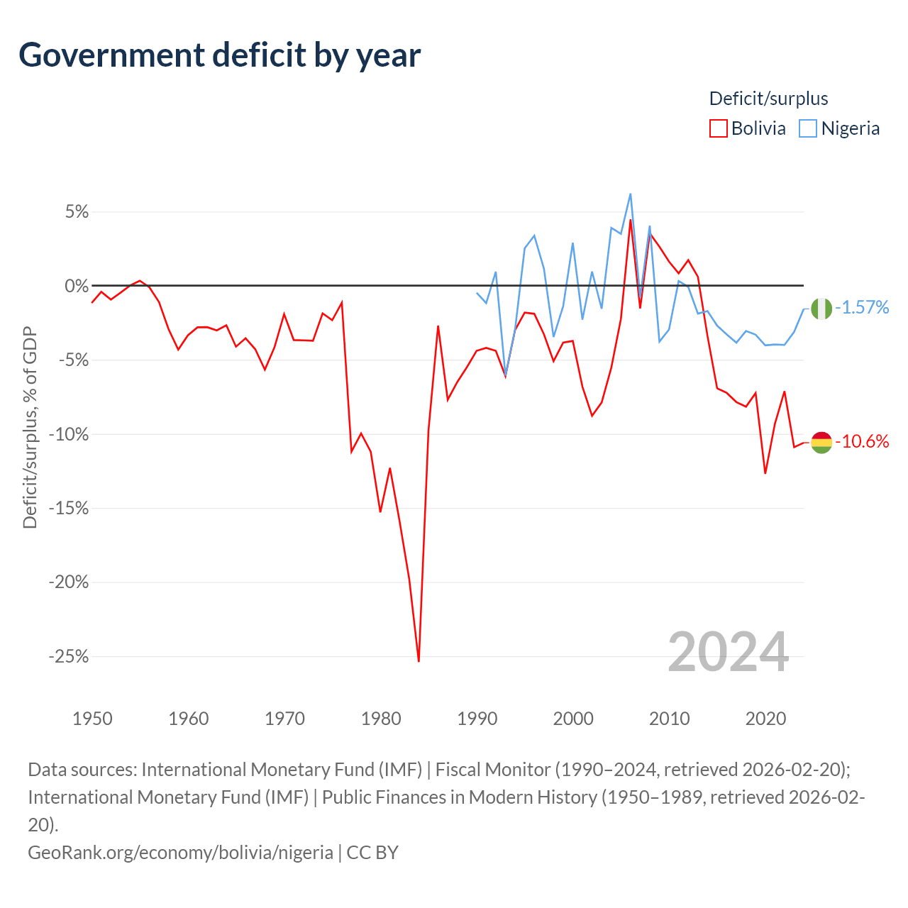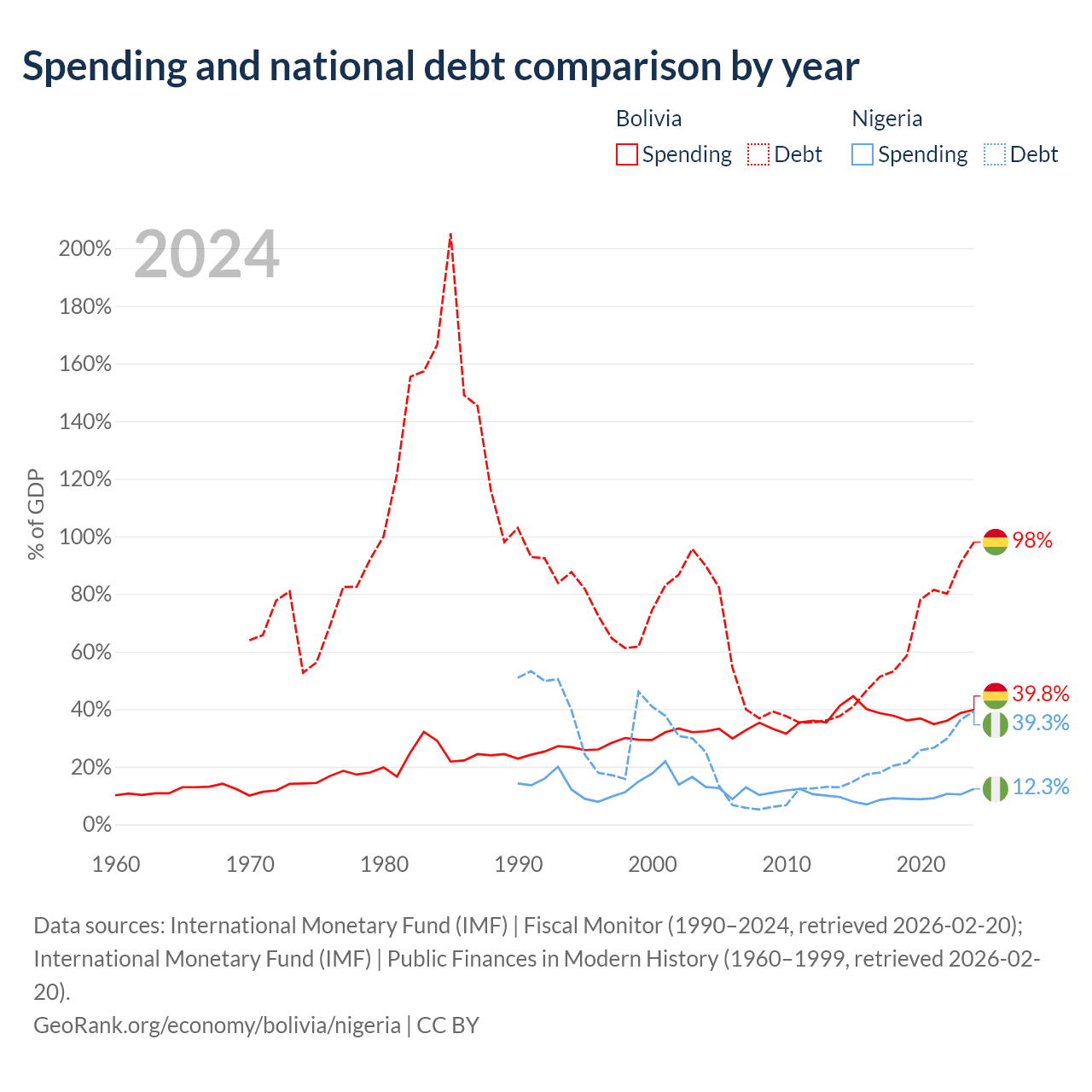 Bolivia has $53.8B in government debt (98% of GDP), compared to $99.2B (39.3% of GDP) in Nigeria.