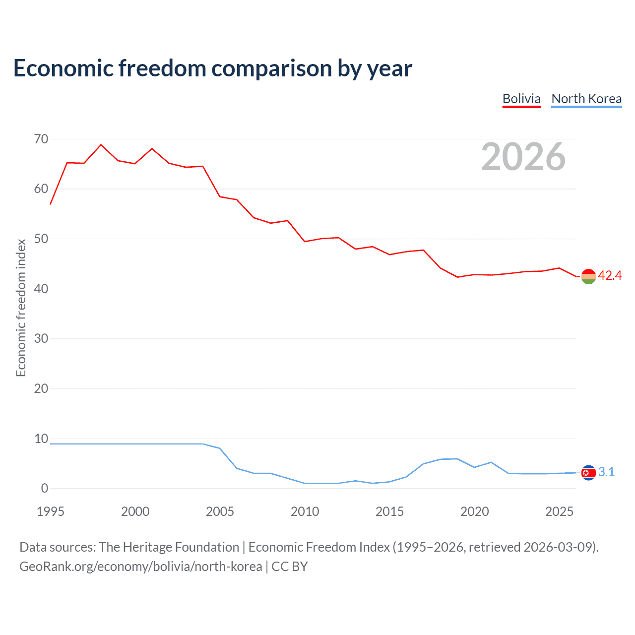 The Economic Freedom Index for Bolivia is 42.4, ranking 184/197, compared to 3.1 for North Korea, ranking 197/197. The chart above displays a comparison of annual changes in economic freedom indexes.