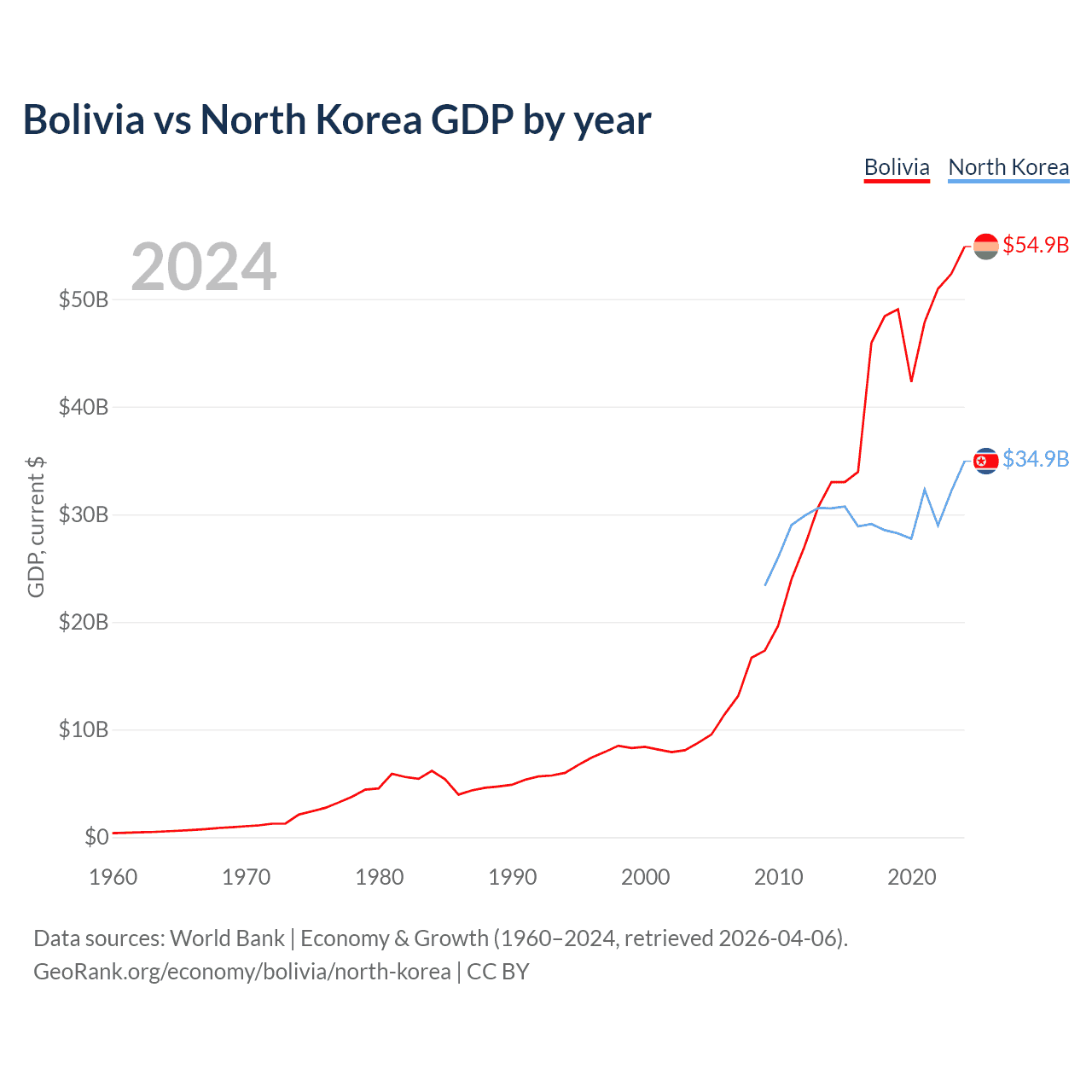 Bolivia has a GDP of $54.9B compared to $34.9B for North Korea, ranking 88/197 and 106/197 by economy size, respectively.