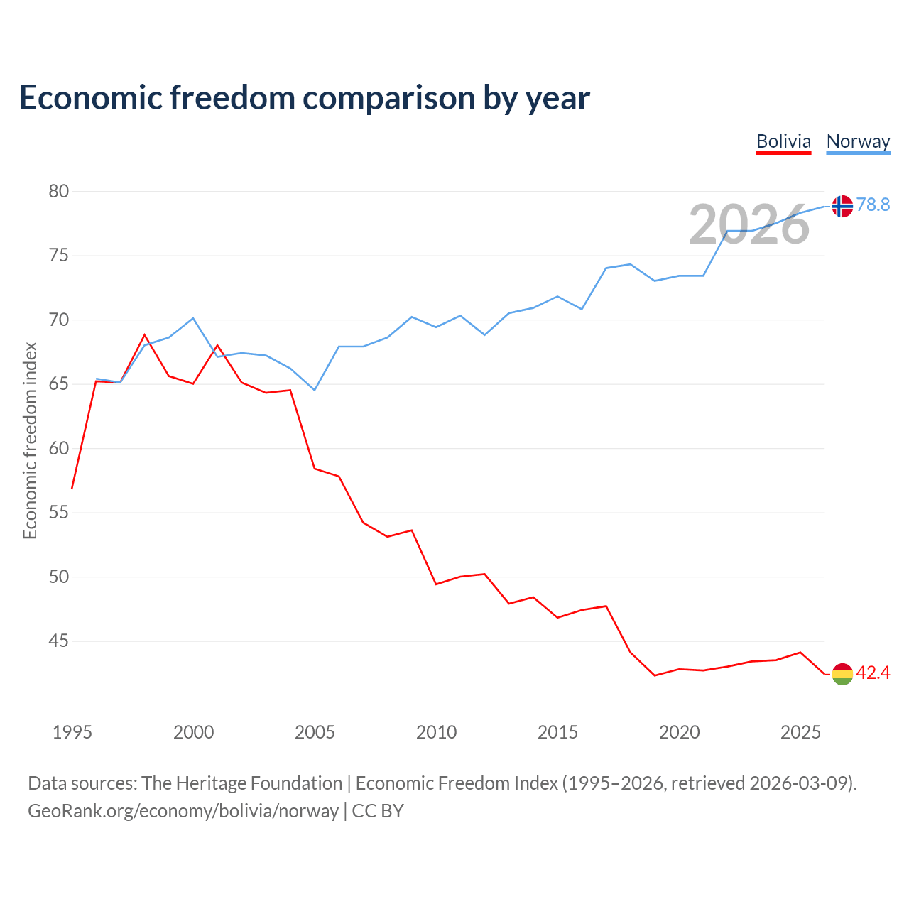 The Economic Freedom Index for Bolivia is 42.4, ranking 184/197, compared to 78.8 for Norway, ranking 9/197. The chart above displays a comparison of annual changes in economic freedom indexes.
