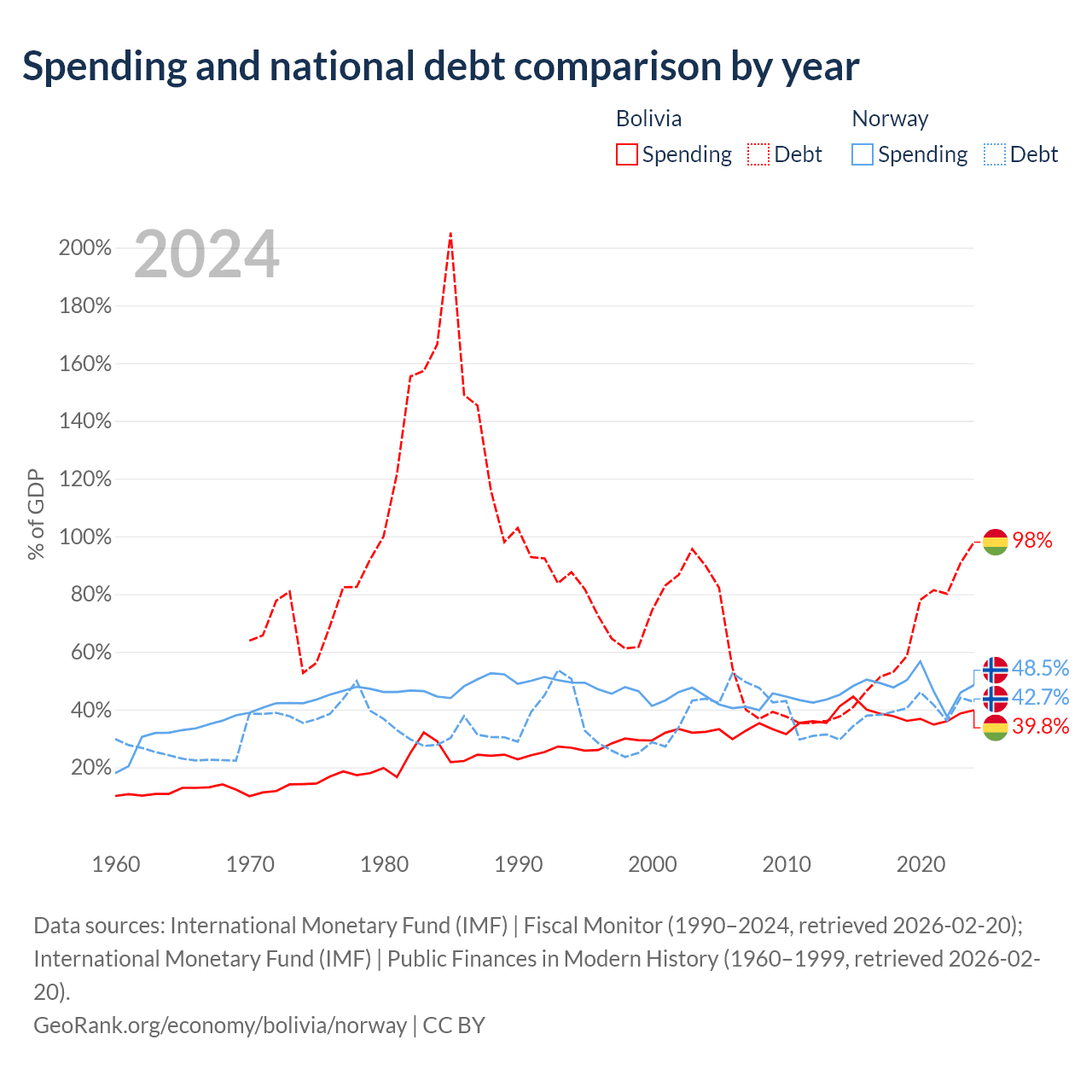 Bolivia has $53.8B in government debt (98% of GDP), compared to $207B (42.7% of GDP) in Norway.