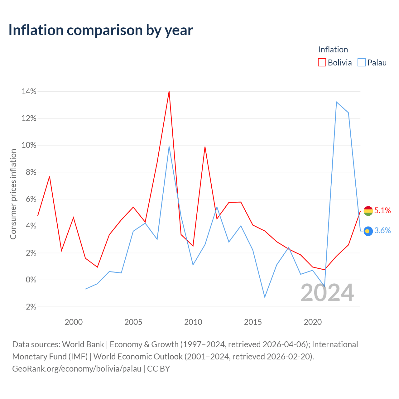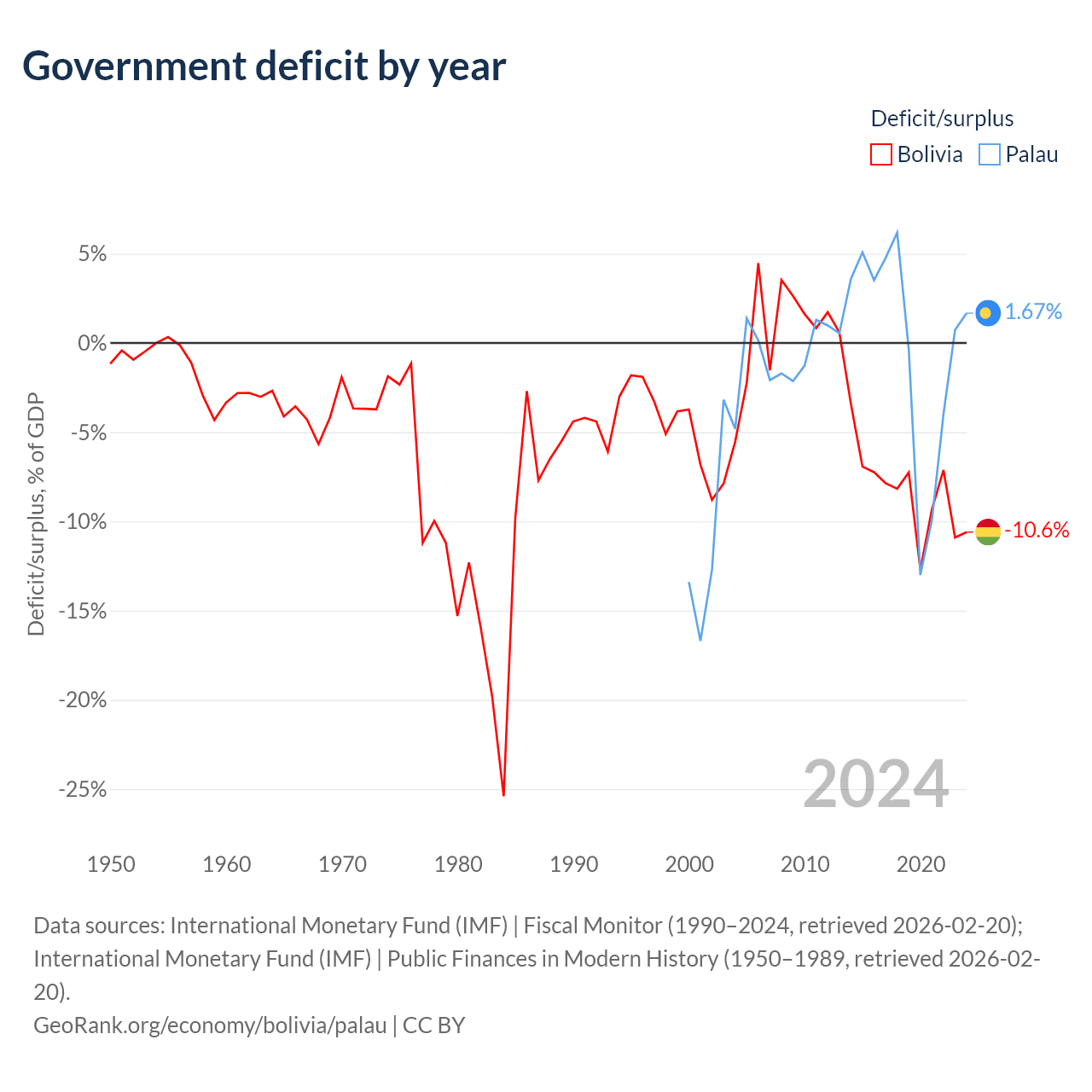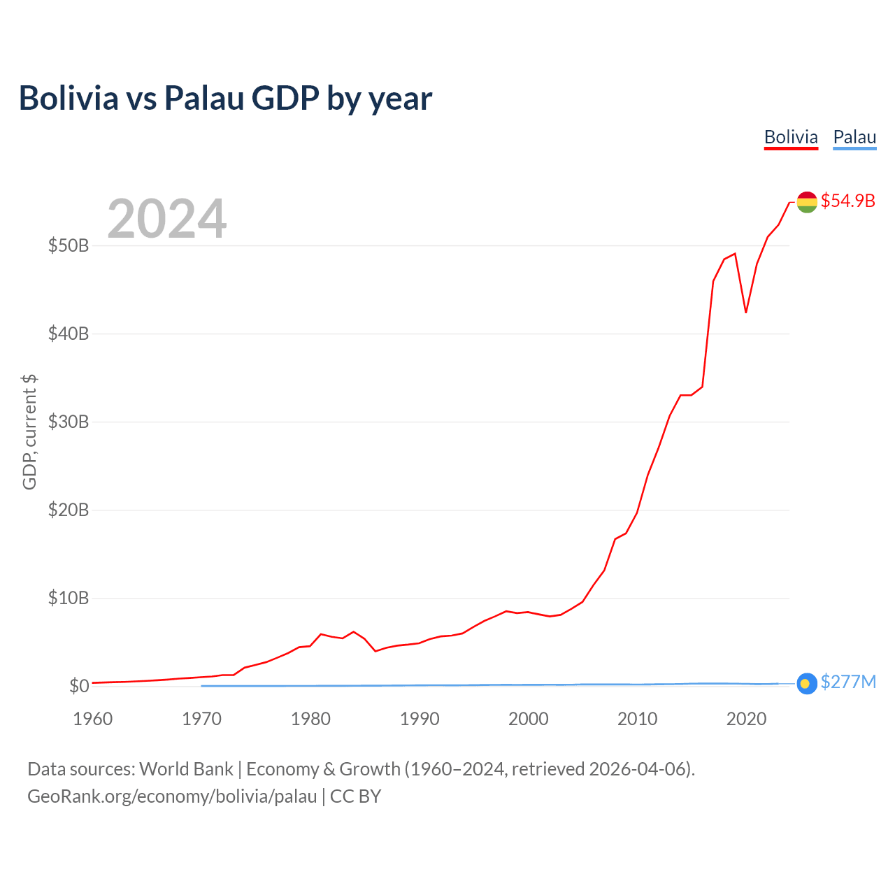 Bolivia has a GDP of $54.9B compared to $277M for Palau, ranking 88/197 and 194/197 by economy size, respectively.