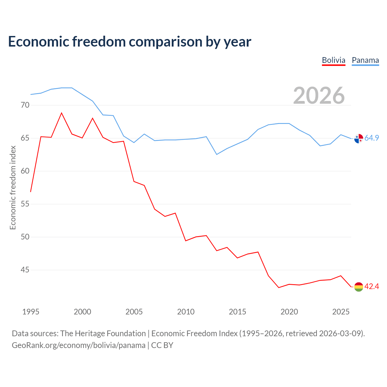 The Economic Freedom Index for Bolivia is 42.4, ranking 184/197, compared to 64.9 for Panama, ranking 70/197. The chart above displays a comparison of annual changes in economic freedom indexes.