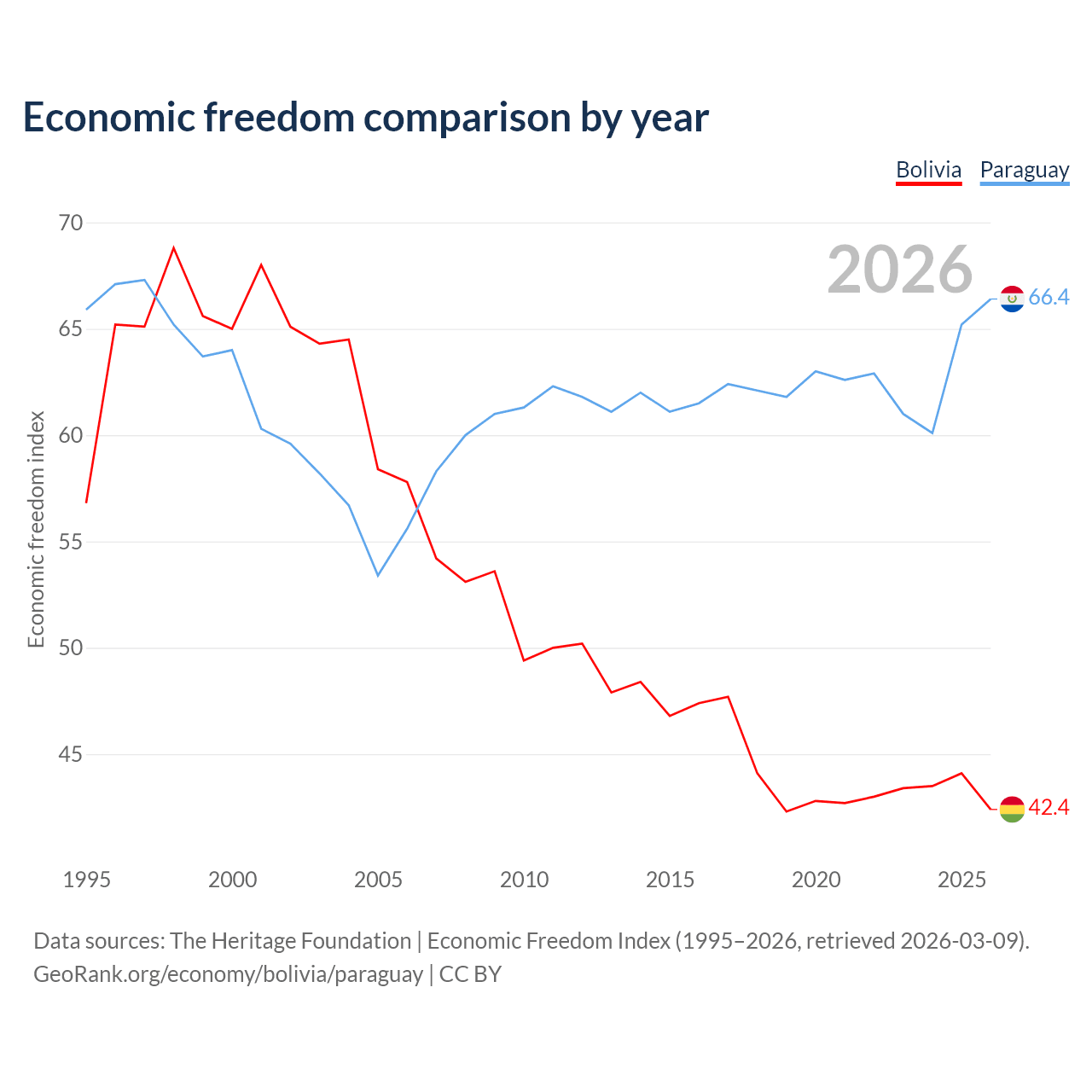 The Economic Freedom Index for Bolivia is 42.4, ranking 184/197, compared to 66.4 for Paraguay, ranking 61/197. The chart above displays a comparison of annual changes in economic freedom indexes.