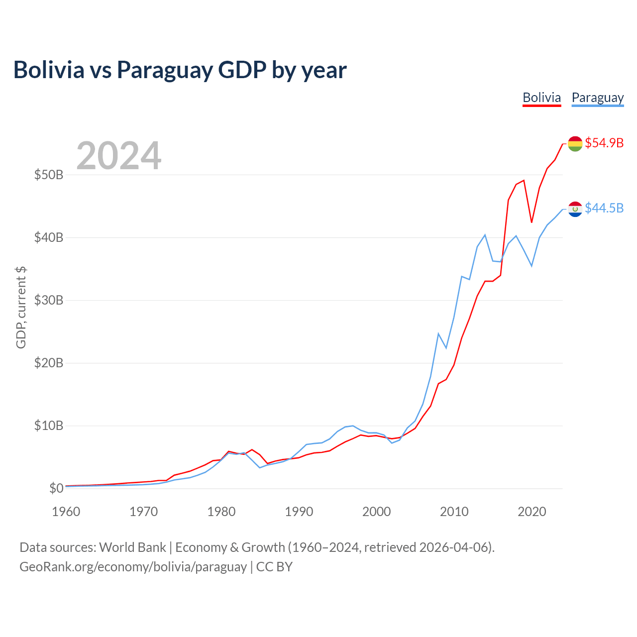 Bolivia vs Paraguay GDP by year