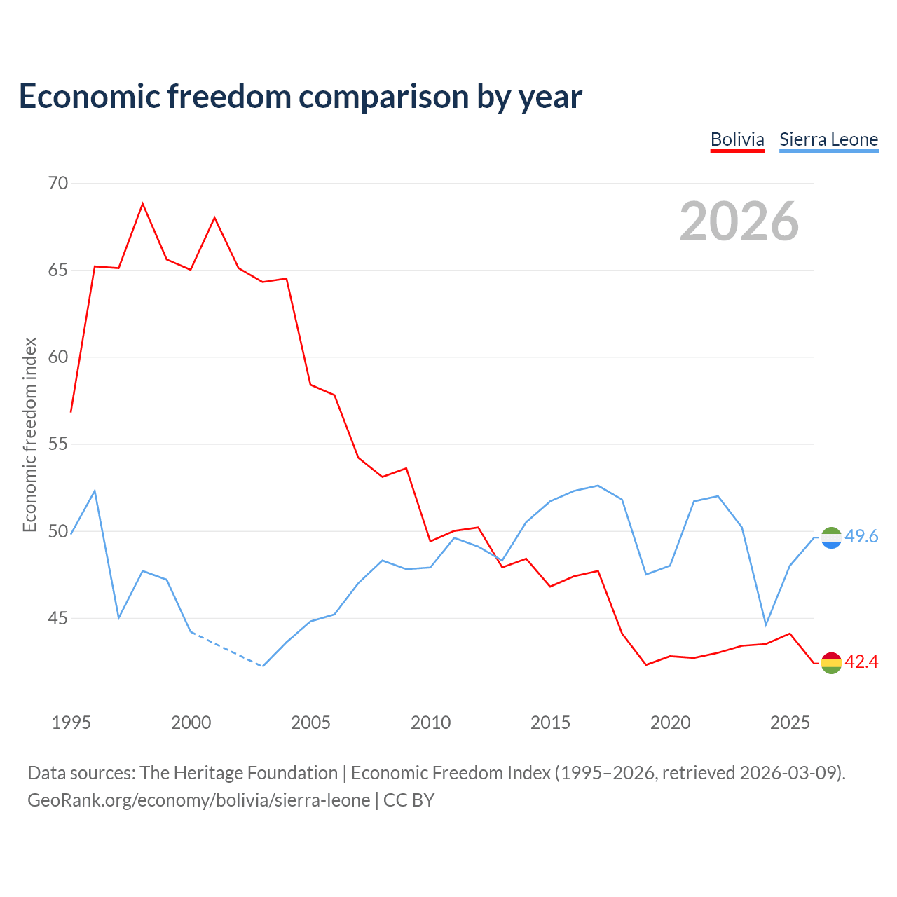 The Economic Freedom Index for Bolivia is 42.4, ranking 184/197, compared to 49.6 for Sierra Leone, ranking 165/197. The chart above displays a comparison of annual changes in economic freedom indexes.