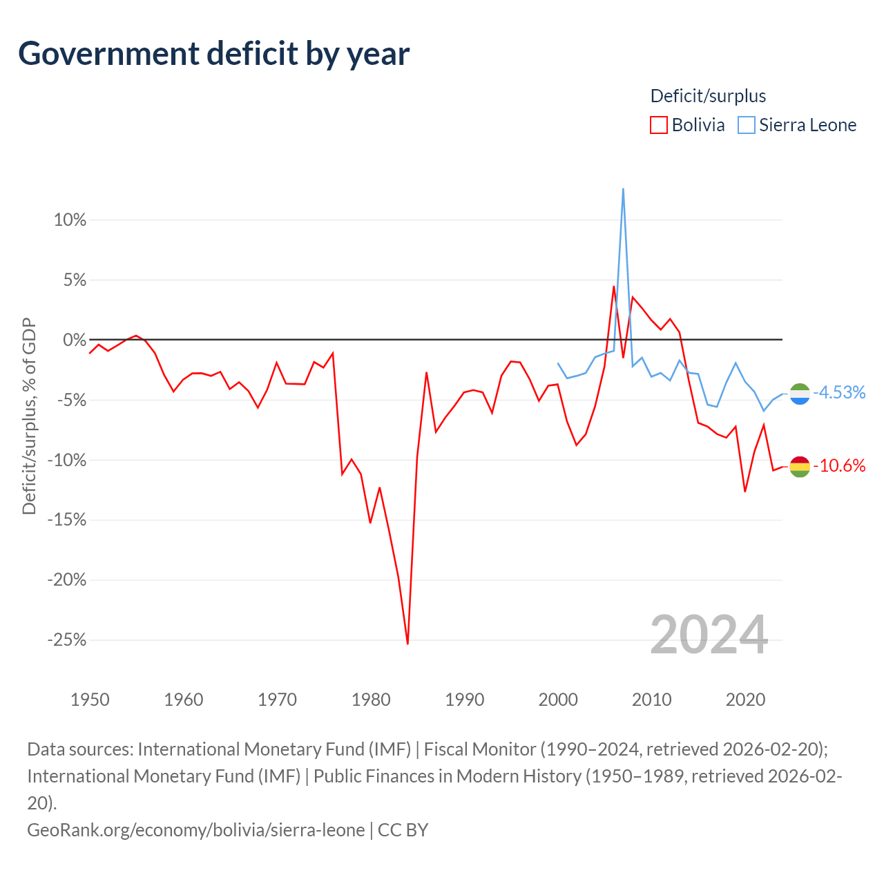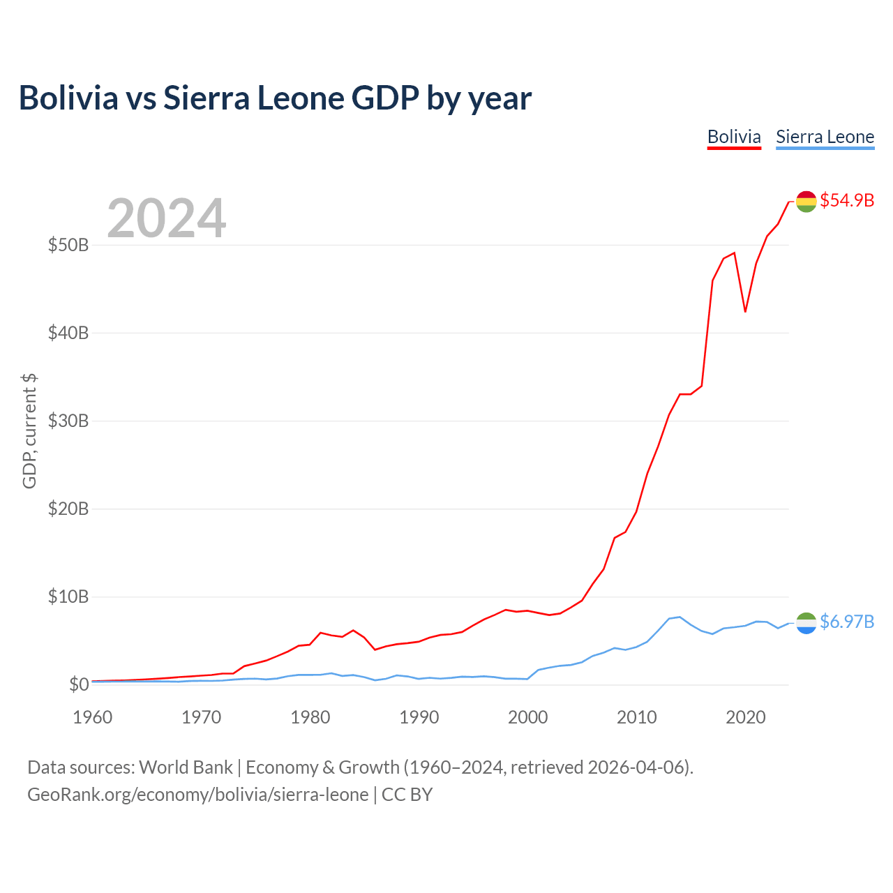Bolivia has a GDP of $54.9B compared to $6.97B for Sierra Leone, ranking 88/197 and 160/197 by economy size, respectively.