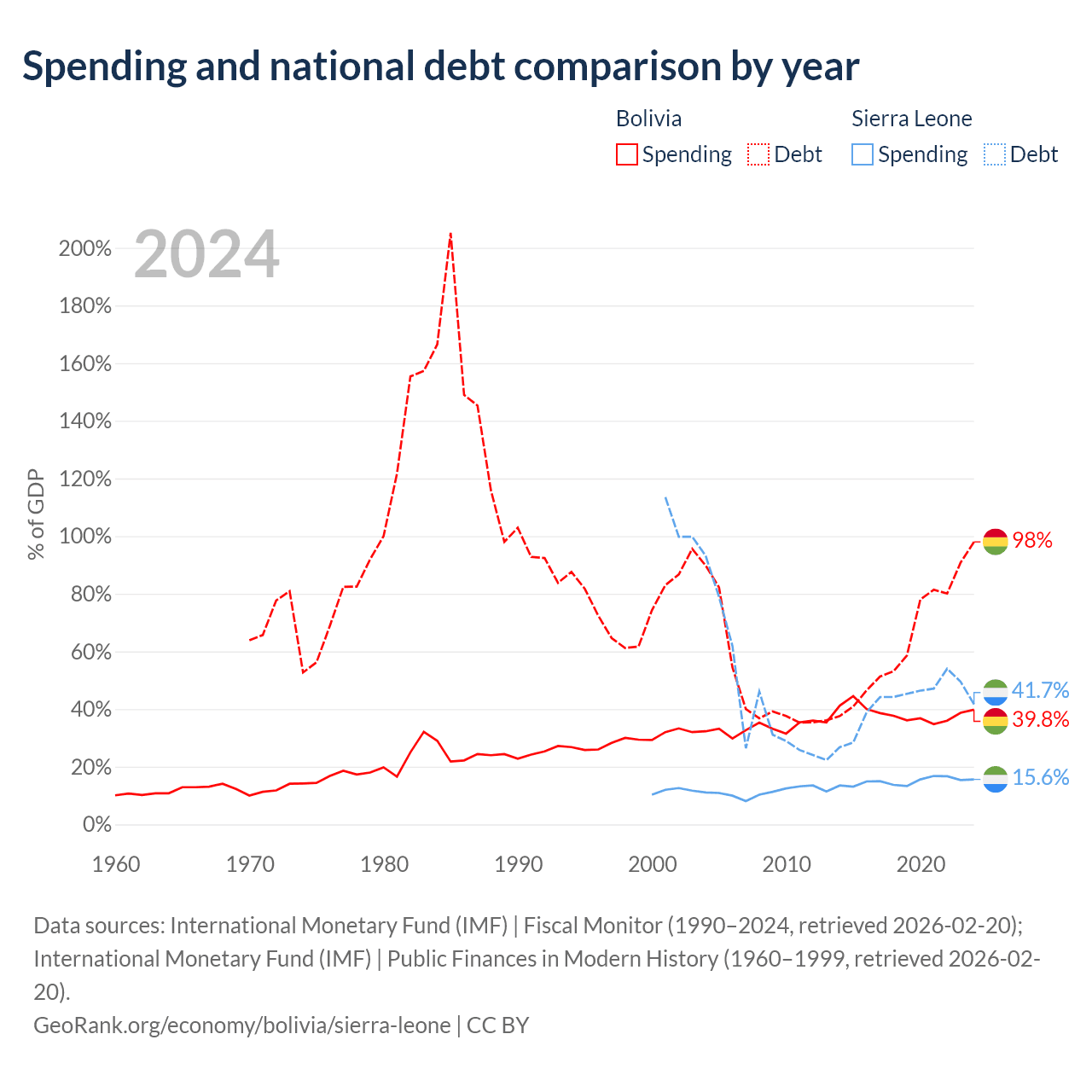 Bolivia has $53.8B in government debt (98% of GDP), compared to $2.91B (41.7% of GDP) in Sierra Leone.