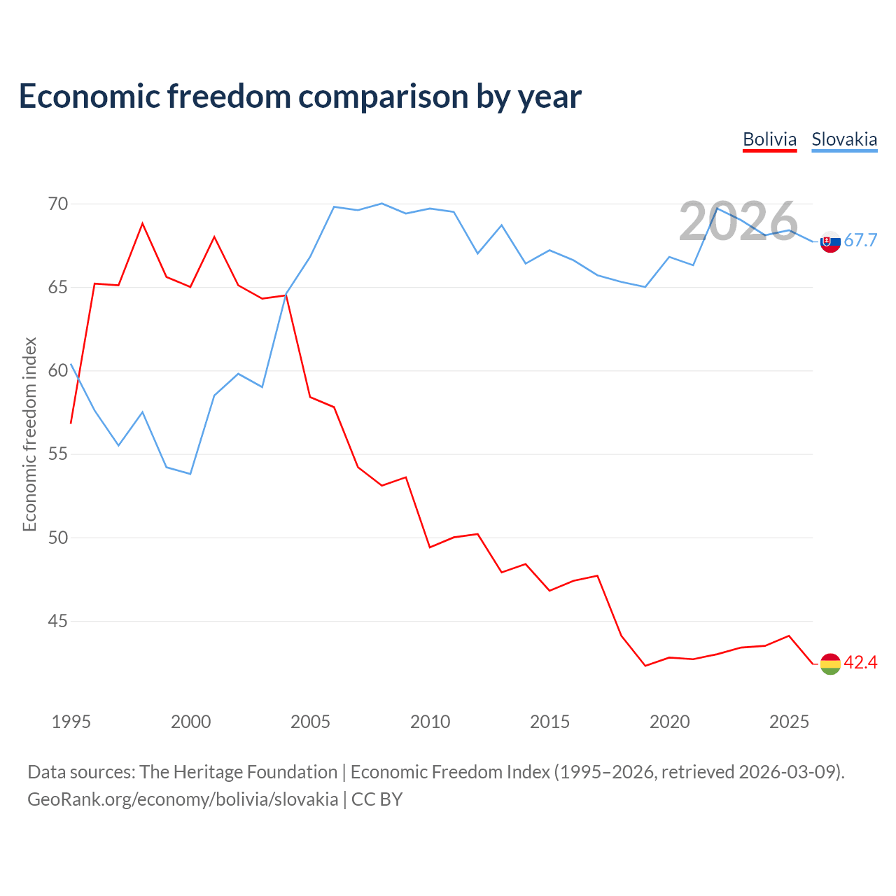 The Economic Freedom Index for Bolivia is 42.4, ranking 184/197, compared to 67.7 for Slovakia, ranking 54/197. The chart above displays a comparison of annual changes in economic freedom indexes.