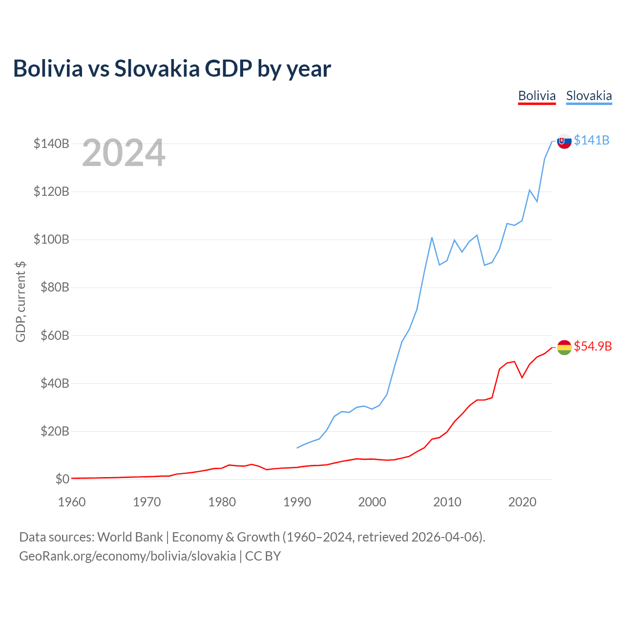 Bolivia has a GDP of $54.9B compared to $141B for Slovakia, ranking 88/197 and 61/197 by economy size, respectively.