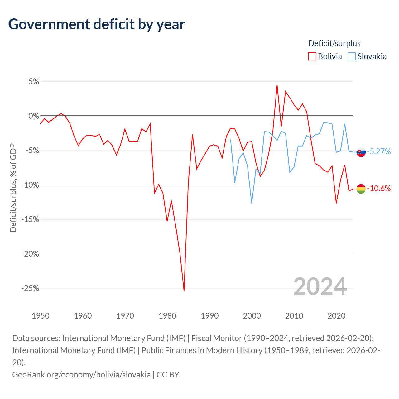 Bolivia has $53.8B in government debt (98% of GDP), compared to $80.7B (57.2% of GDP) in Slovakia.