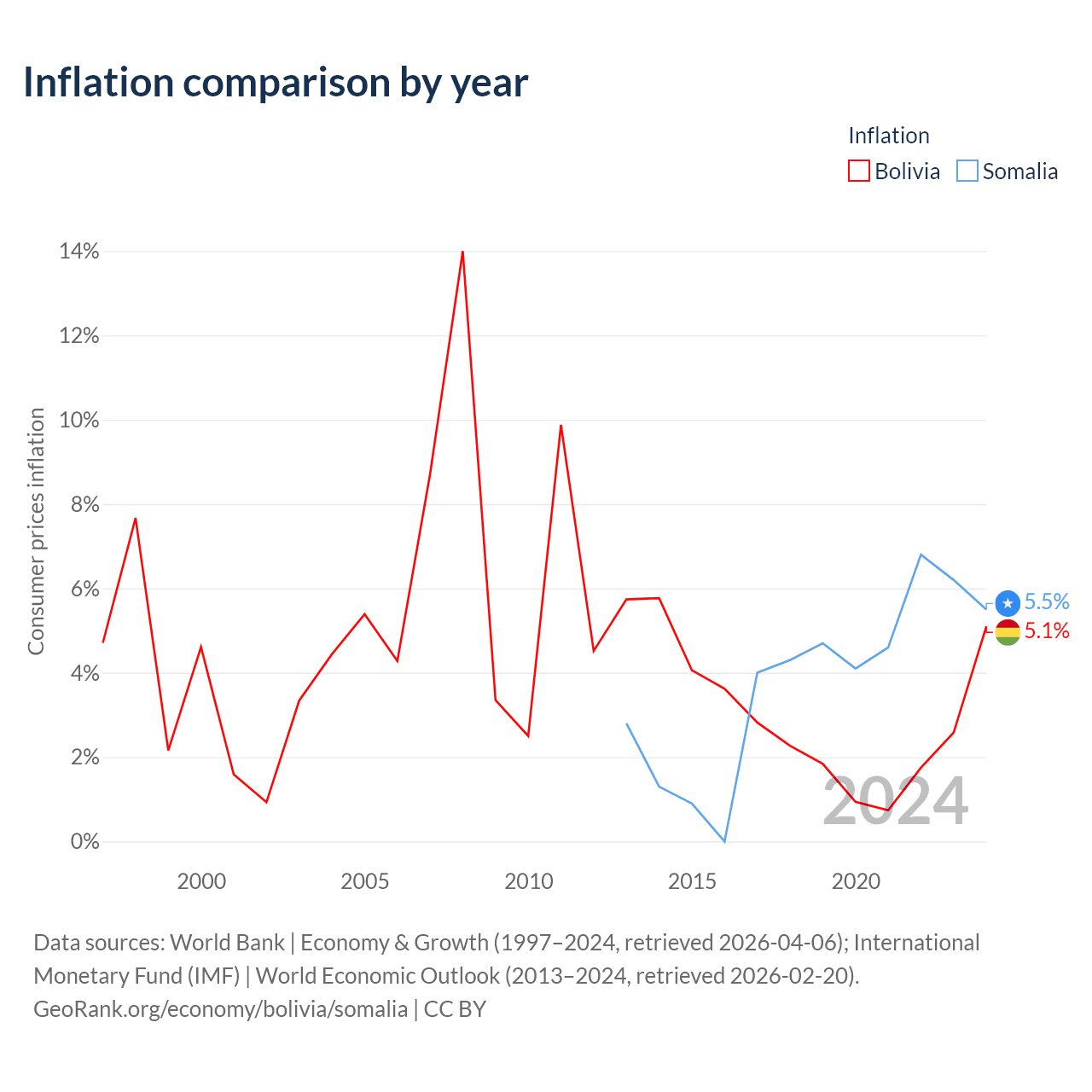 Over the past 12 years, Bolivia has recorded an average annual inflation rate of 3.1%, compared with 3.77% in Somalia. In 2024, inflation was 5.1% in Bolivia and 5.5% in Somalia.