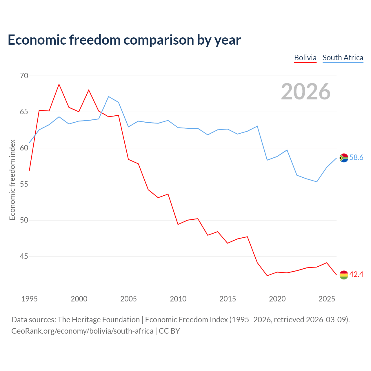 The Economic Freedom Index for Bolivia is 42.4, ranking 184/197, compared to 58.6 for South Africa, ranking 110/197. The chart above displays a comparison of annual changes in economic freedom indexes.