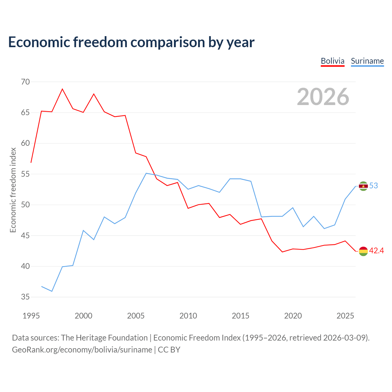 The Economic Freedom Index for Bolivia is 42.4, ranking 184/197, compared to 53 for Suriname, ranking 143/197. The chart above displays a comparison of annual changes in economic freedom indexes.