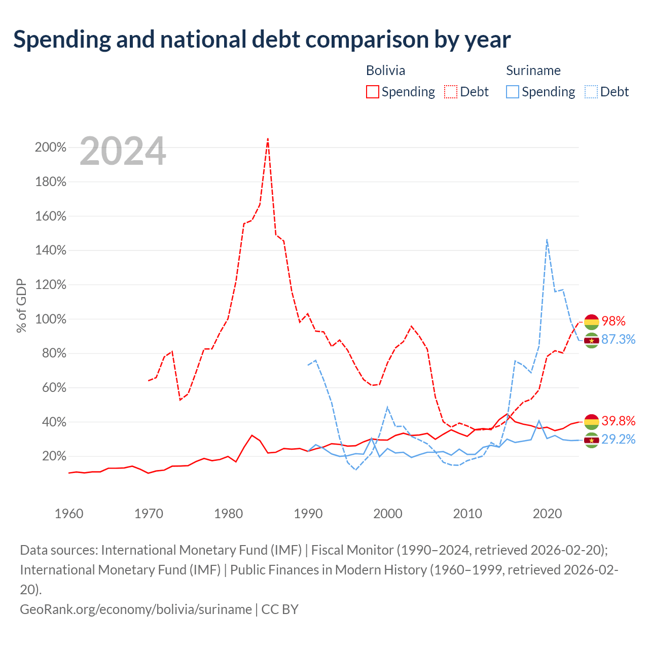 Bolivia has $53.8B in government debt (98% of GDP), compared to $3.86B (87.3% of GDP) in Suriname.