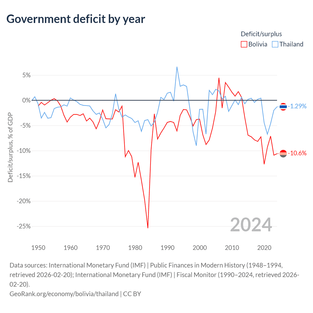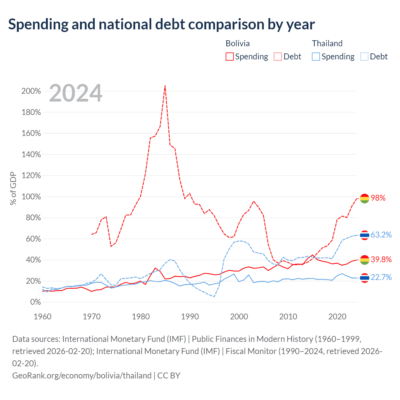 Bolivia has $53.8B in government debt (98% of GDP), compared to $333B (63.2% of GDP) in Thailand.