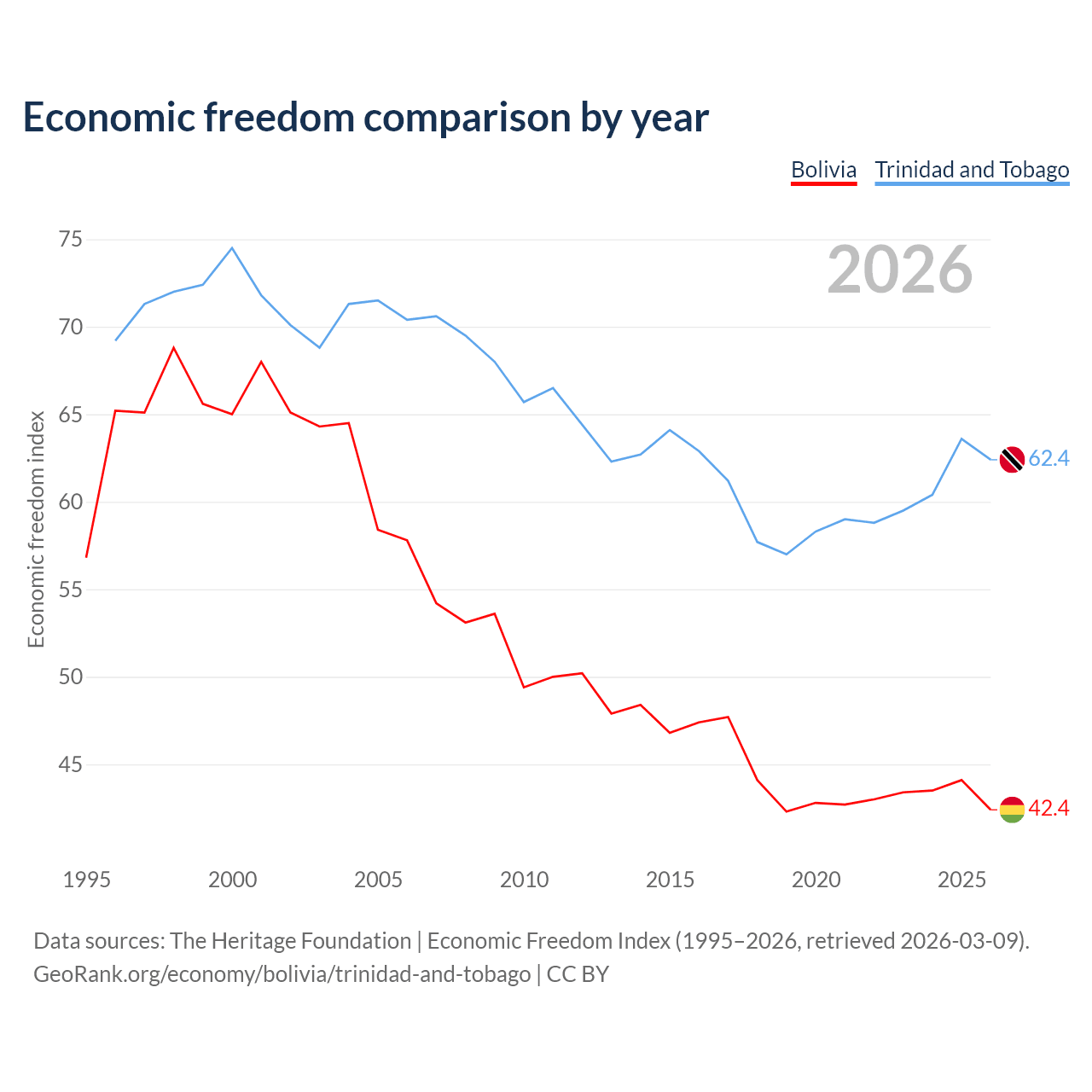 The Economic Freedom Index for Bolivia is 42.4, ranking 184/197, compared to 62.4 for Trinidad and Tobago, ranking 87/197. The chart above displays a comparison of annual changes in economic freedom indexes.