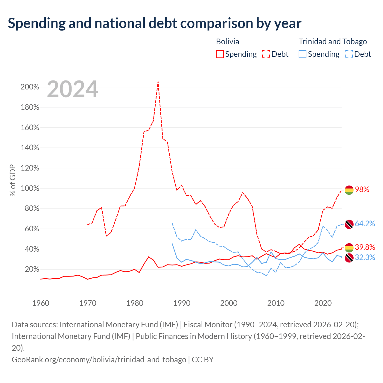 Bolivia has $53.8B in government debt (98% of GDP), compared to $16.5B (64.2% of GDP) in Trinidad and Tobago.