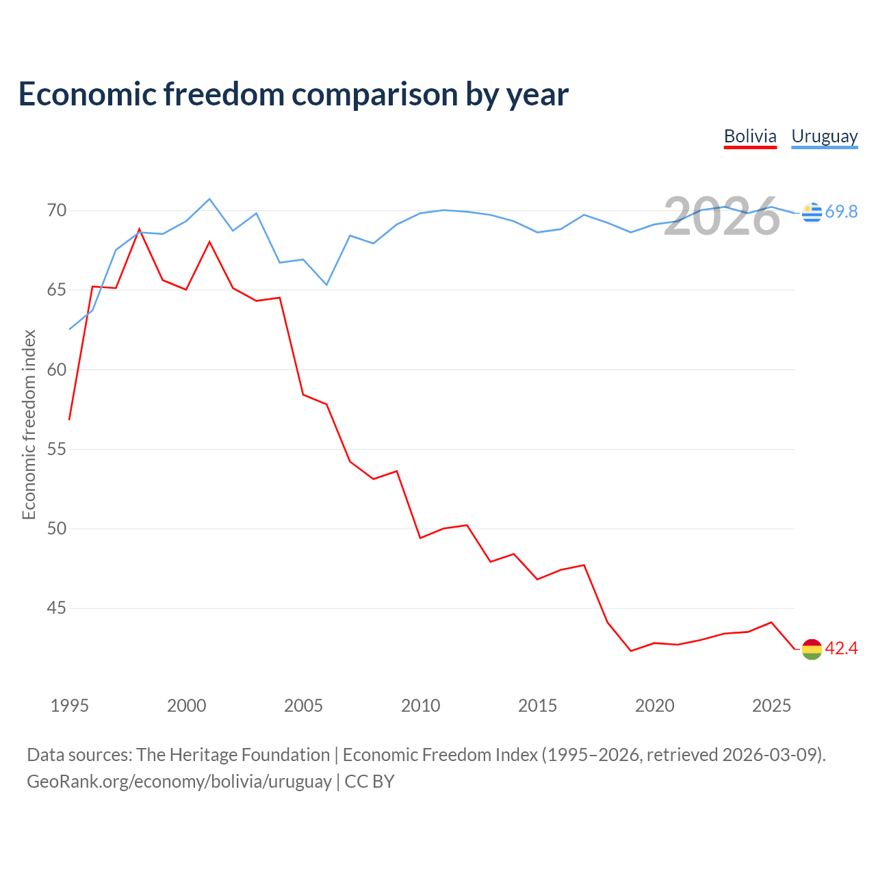 The Economic Freedom Index for Bolivia is 42.4, ranking 184/197, compared to 69.8 for Uruguay, ranking 39/197. The chart above displays a comparison of annual changes in economic freedom indexes.