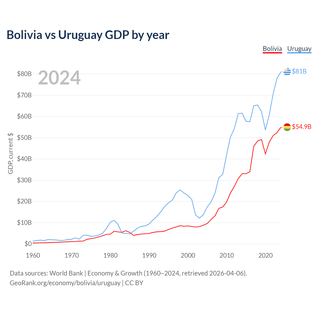 Bolivia has a GDP of $54.9B compared to $81B for Uruguay, ranking 88/197 and 81/197 by economy size, respectively.