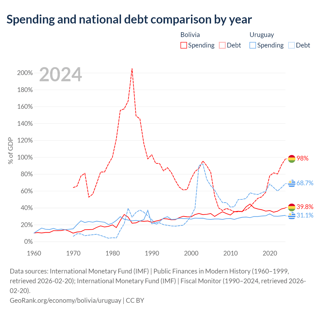 Bolivia has $53.8B in government debt (98% of GDP), compared to $55.6B (68.7% of GDP) in Uruguay.