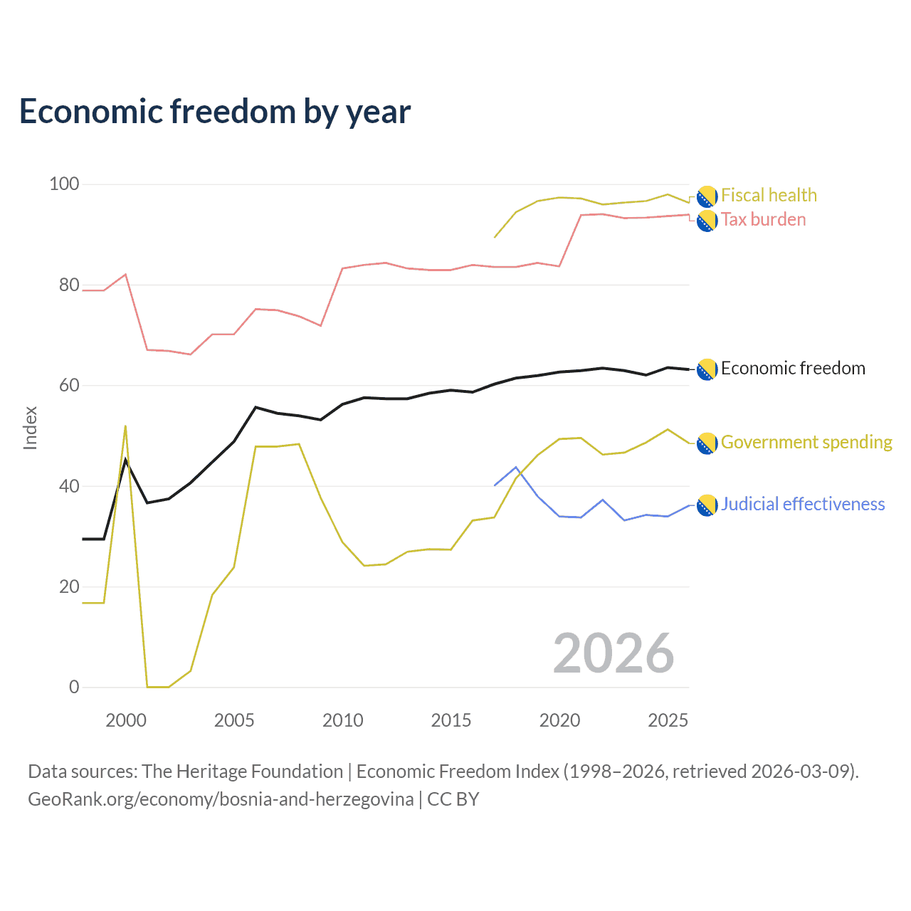 Bosnia and Herzegovina is ranked 76/174 for economic freedom with a score of 63.1, compared to 105/162 and a score of 55.6 in 2006.