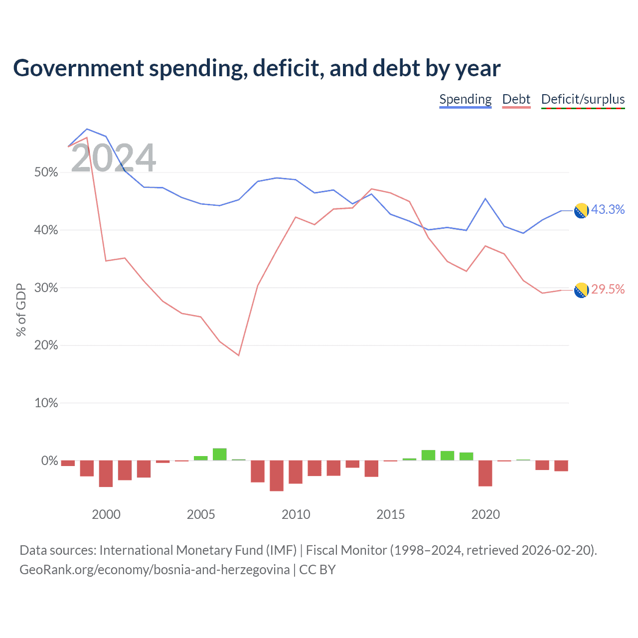 Bosnia and Herzegovina ranked 111/197 by economy size with a GDP of $29.6B and 87/197 by GDP per capita at $9,359. Bosnia and Herzegovina has $8.74B in government debt, with a debt-to-GDP ratio of 29.5%.
